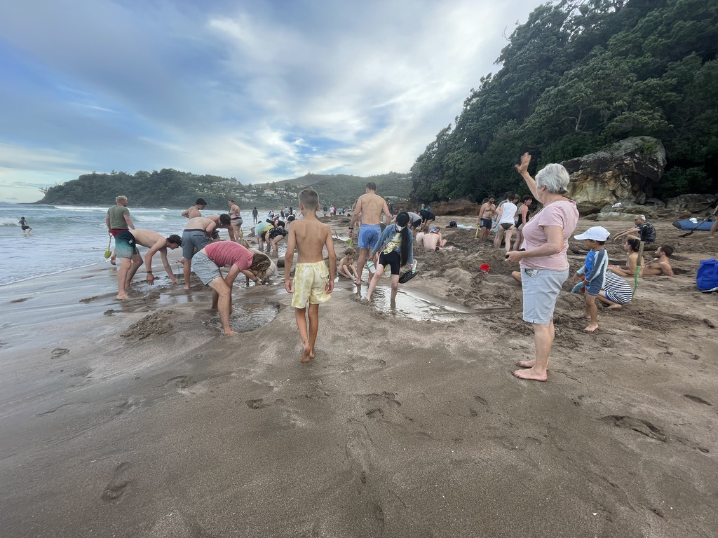 傍晚去 Hot Water Beach(落潮前2小时)。落潮时间:21:22, 18/12;9:42, 19/12。我们大概18:30到的热水海滩,已经有不少人在挖热水池子,我们发现只在热水源流经的地方挖,水会很烫。于是就在冷热水交接的地方挖(没有带锹,用手挖)一个小池子,左侧进热水、右侧进冷水,混合一下正合适。热水海滩实际上是海滩上有温泉,源源不断。涨潮的时候被淹没在海水下,只有落潮的时候才显露出来。挺特别的。