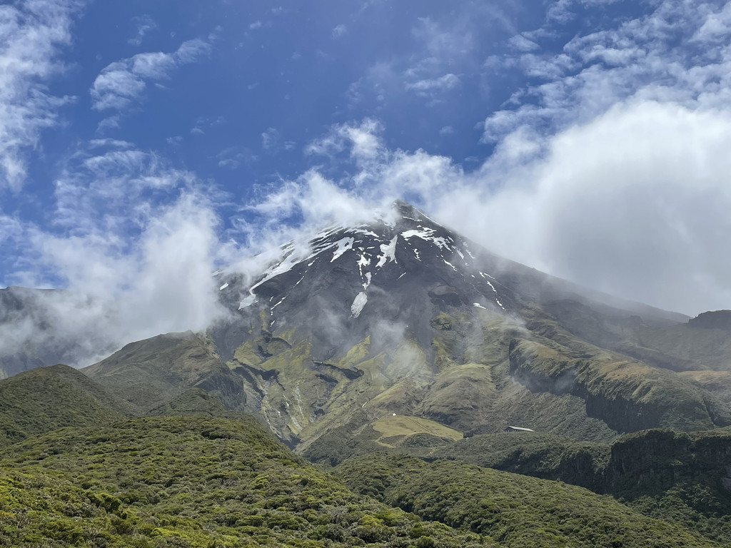 早晨去附近转转,有一个湖还可以。去塔拉纳基山Mt. Taranaki,搜索:Stratford Mountain House;距离:255KM,车程3小时20分钟。塔拉纳基山号称新西兰的富士山,不过这个季节山上只有零星的雪,不那么漂亮,应该是冬天会挺漂亮。到达山腰观景点,山头被云雾覆盖,等了好久,才偶尔看到山尖,也算不虚此行。