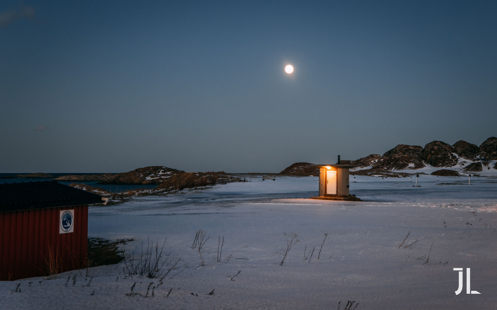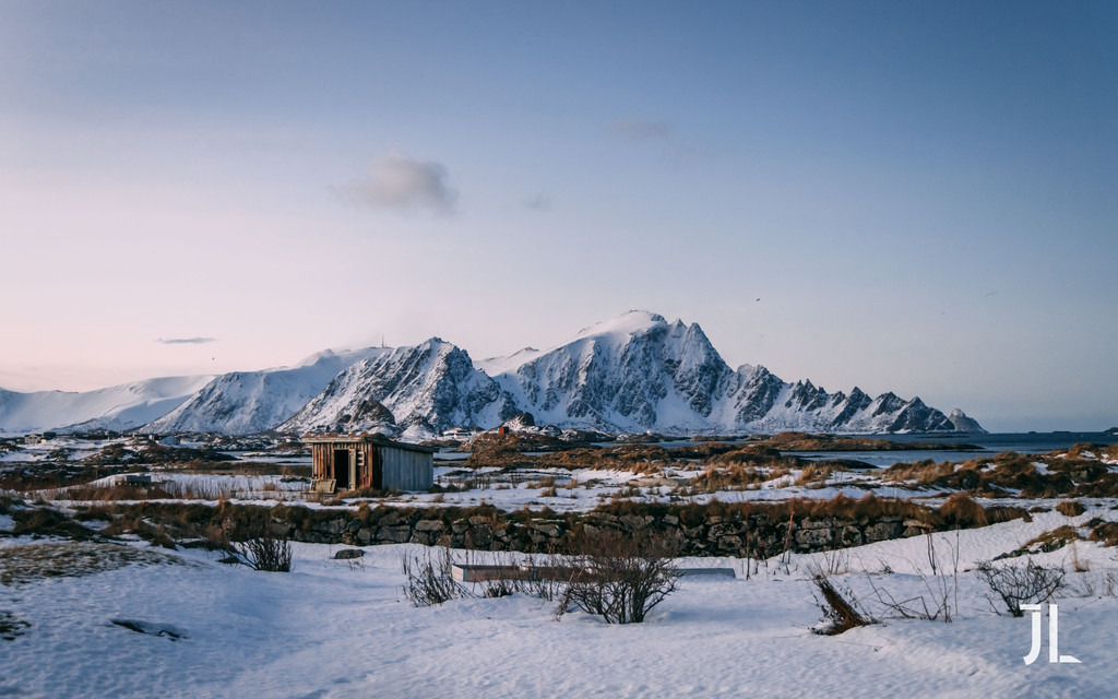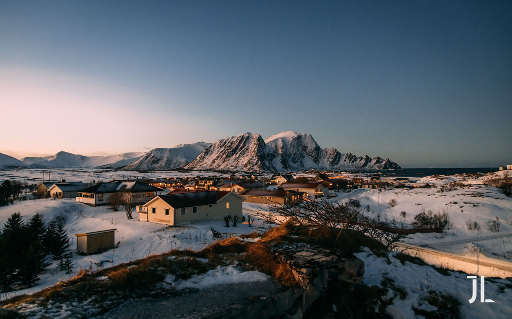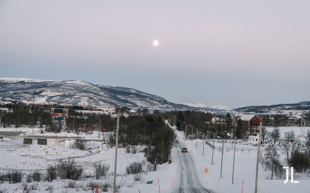 取完行李提好车,不过是早上十一点刚过不久,但此时太阳已经下了山,而月亮已经高高的挂在了天际上。整个天空像一块巨大的柔光板,被冷空气打磨得格外澄澈,地平线附近浮动着迷人的粉与金,往上过渡到淡蓝,再一点点至深蓝。我虽早已做好了冬令时的罗弗敦日照时间会很少的心理准备,在这片接近北极圈的群岛上,每年十一月中旬起,太阳便开始它为期数周的“失踪”,但真正站在这无声的天地之间,面对这大早上便已黄昏的天象,仍感到赞叹和惊奇,时间在此地失去了线性秩序,旅途也在这一刻真正开始。