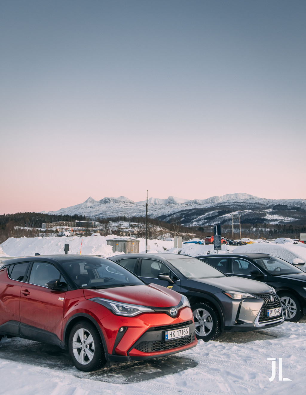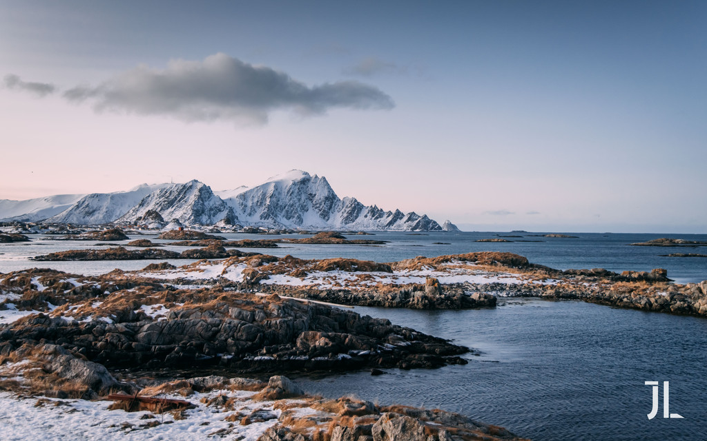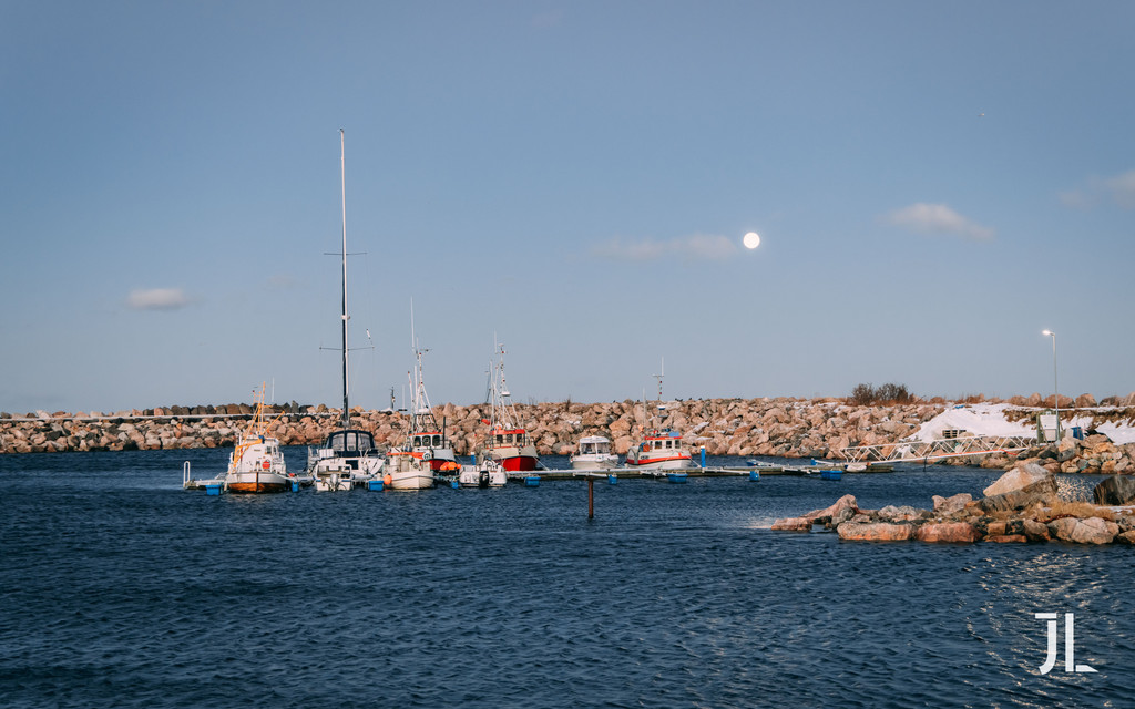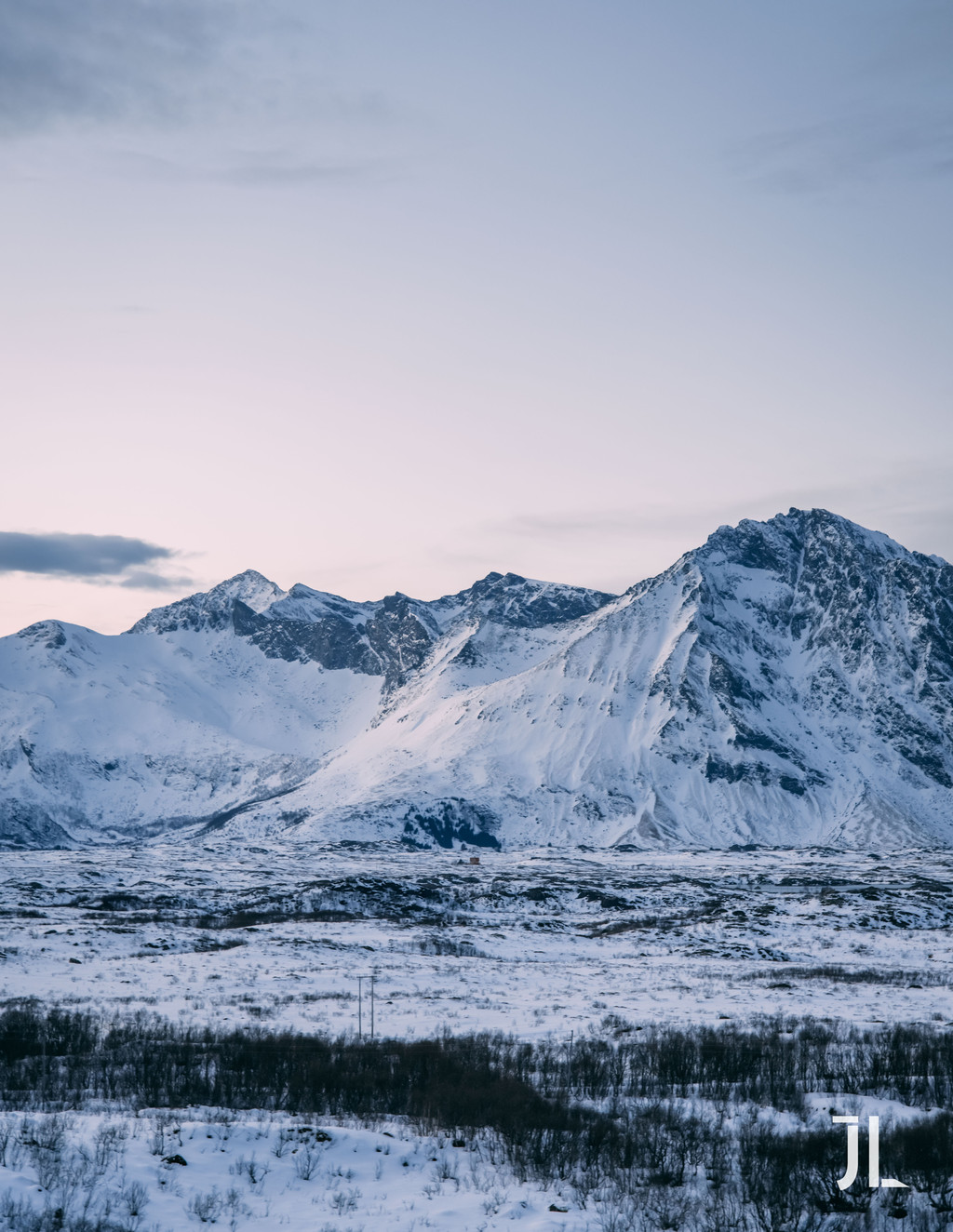 取完行李提好车,不过是早上十一点刚过不久,但此时太阳已经下了山,而月亮已经高高的挂在了天际上。整个天空像一块巨大的柔光板,被冷空气打磨得格外澄澈,地平线附近浮动着迷人的粉与金,往上过渡到淡蓝,再一点点至深蓝。我虽早已做好了冬令时的罗弗敦日照时间会很少的心理准备,在这片接近北极圈的群岛上,每年十一月中旬起,太阳便开始它为期数周的“失踪”,但真正站在这无声的天地之间,面对这大早上便已黄昏的天象,仍感到赞叹和惊奇,时间在此地失去了线性秩序,旅途也在这一刻真正开始。