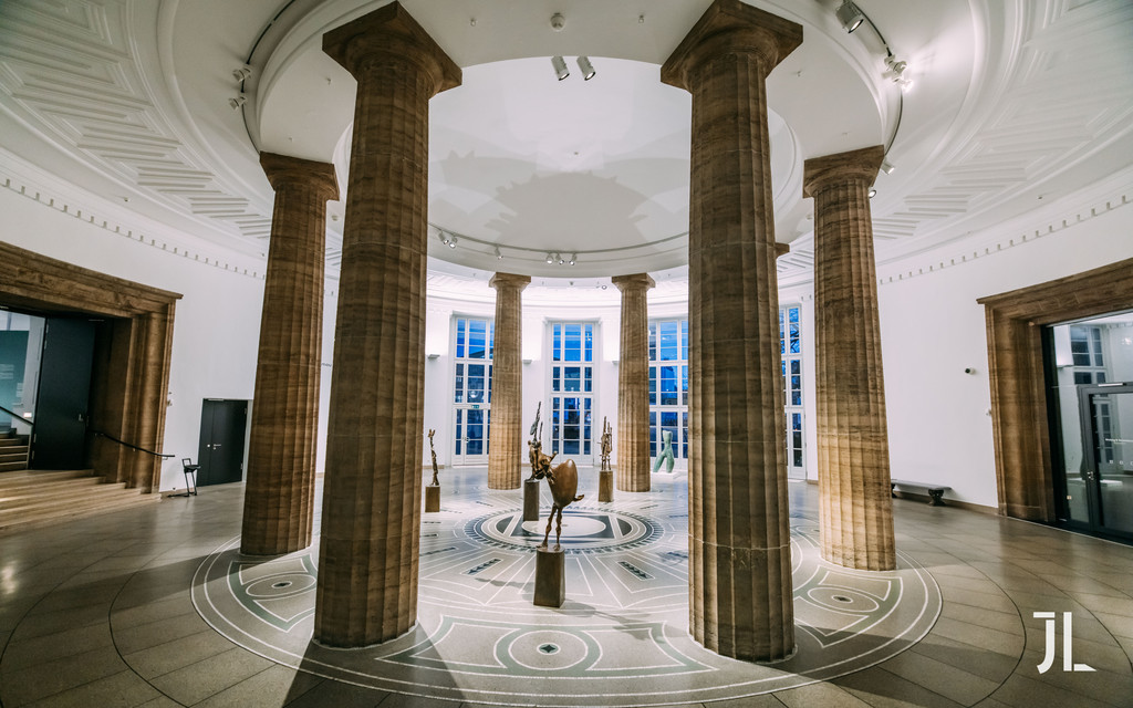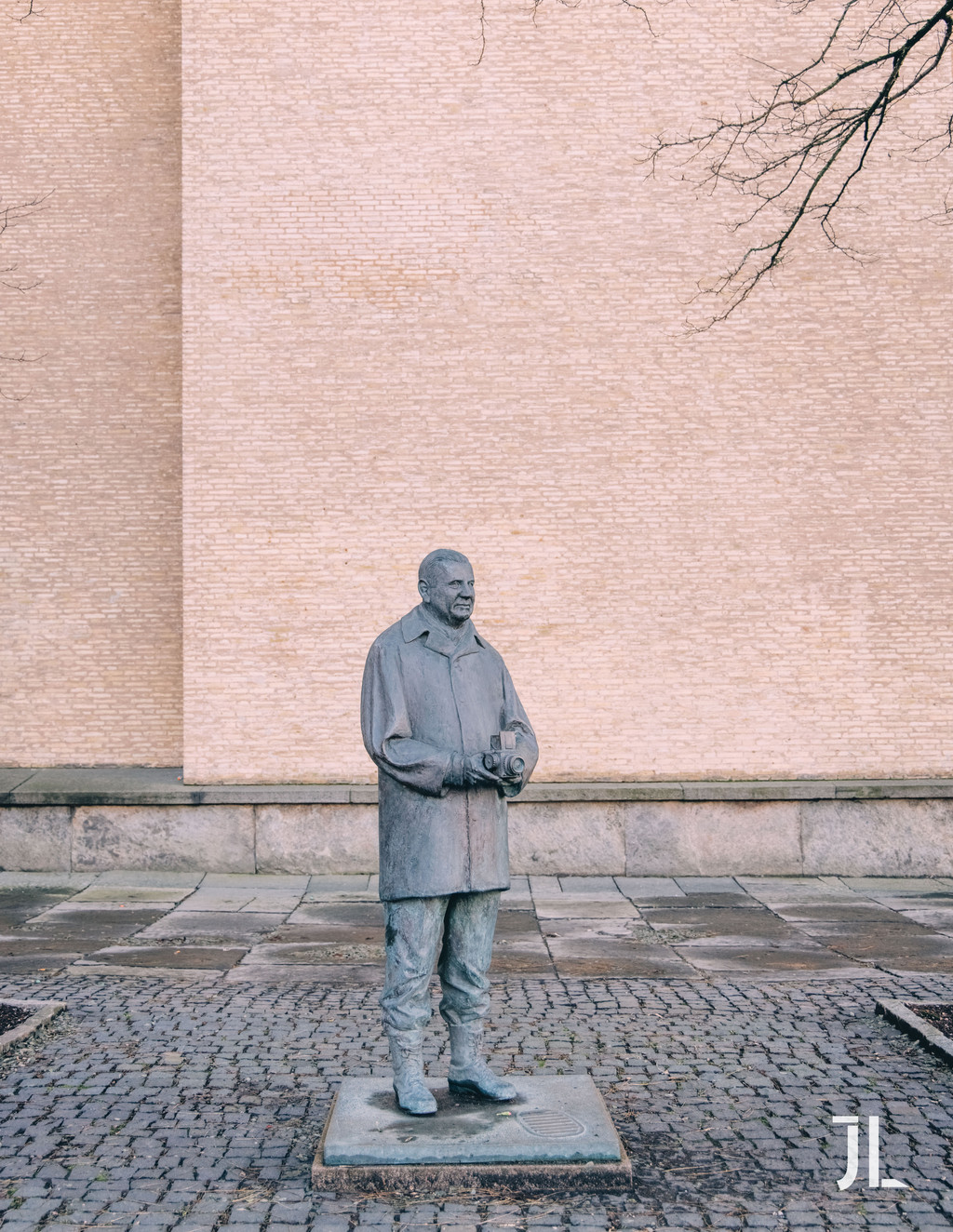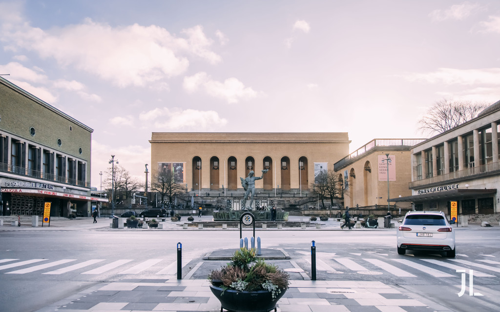 我先去了哥德堡美术馆(Göteborgs Konstmuseum)。沿着马路走到尽头,它伫立在哥塔广场的高地上,庄严厚重的建筑风格让它几乎无法被人错过。门前有一座巨大的波塞冬雕像高举双臂,角落里还有一尊维克特哈苏的雕像,没错就是那个创作登月相机的那个男人。
