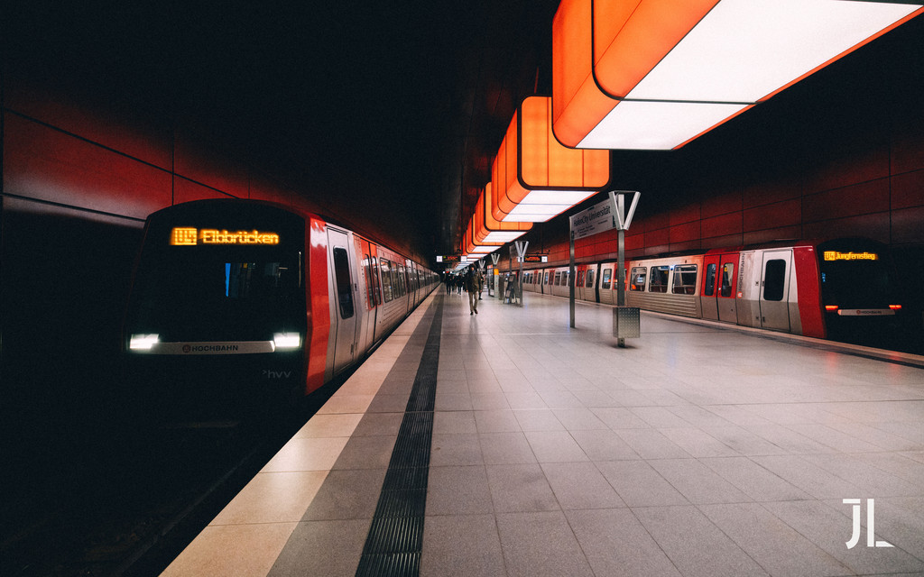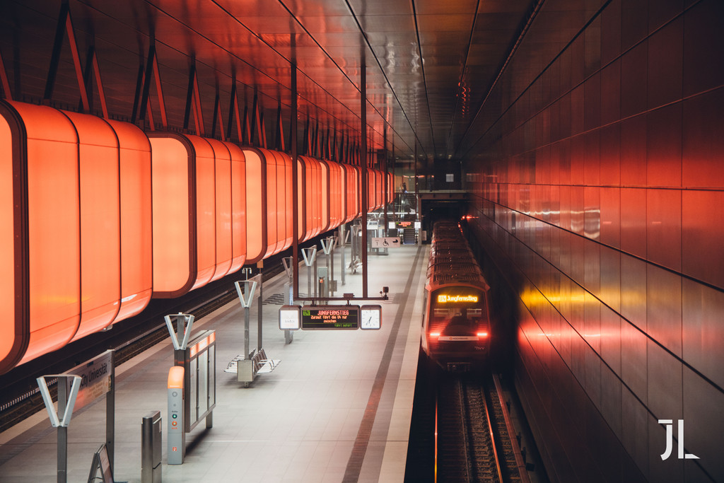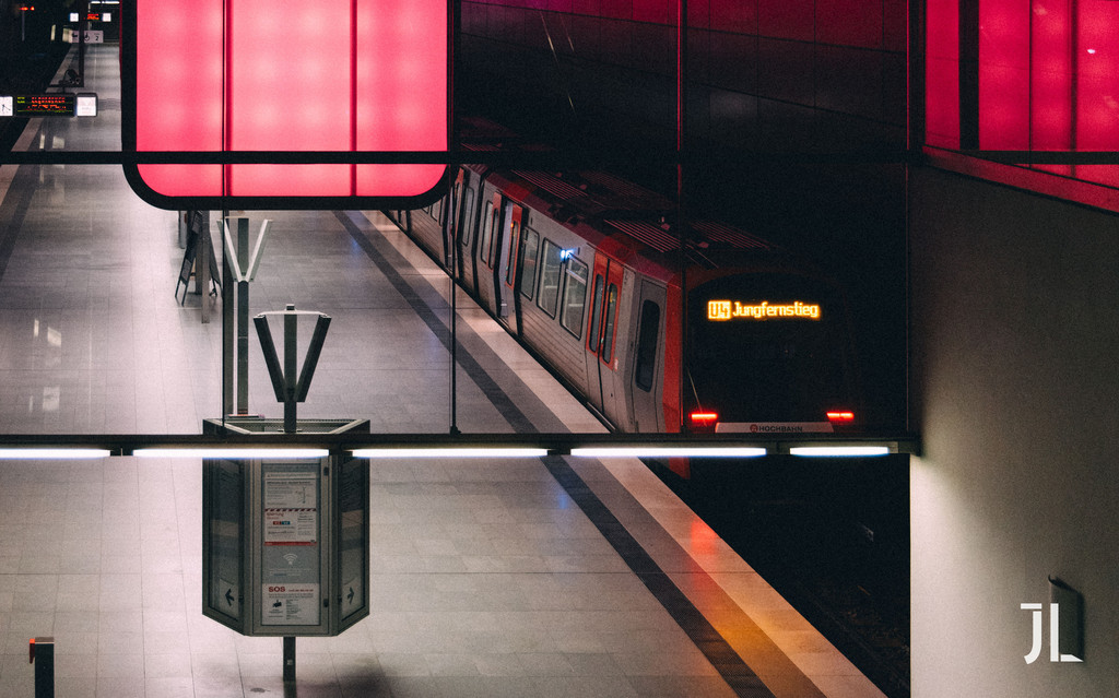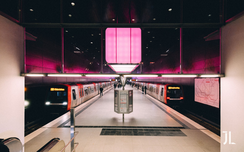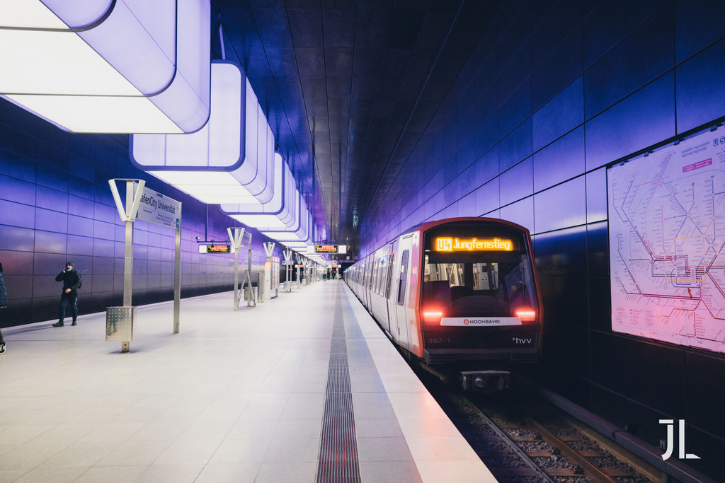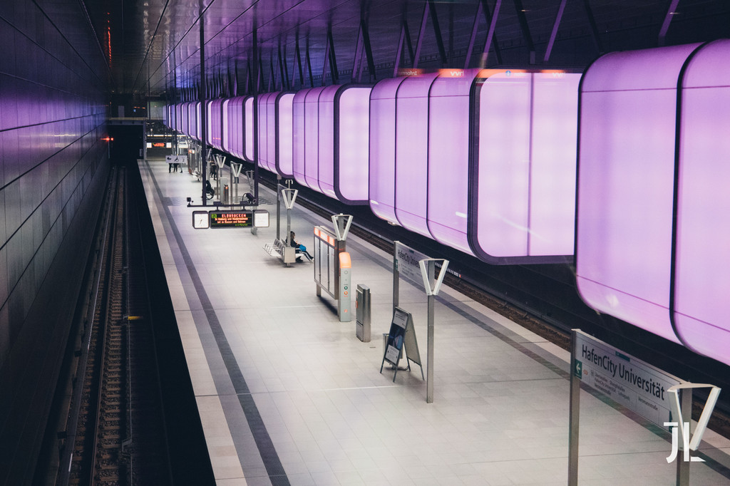 德国的很多地铁其实都很出片,他们的设计风格深受东德的影响保留到了现在,但这一站,HafenCity Universität站,则代表了另一股超现代主义的风潮。仿佛《2001太空漫游》里的场景,巨大的长方体灯箱悬浮在空中,色彩缓缓流转,金属质感的列车滑入,就好像一艘艘穿越时间的飞船带着旅人前行。