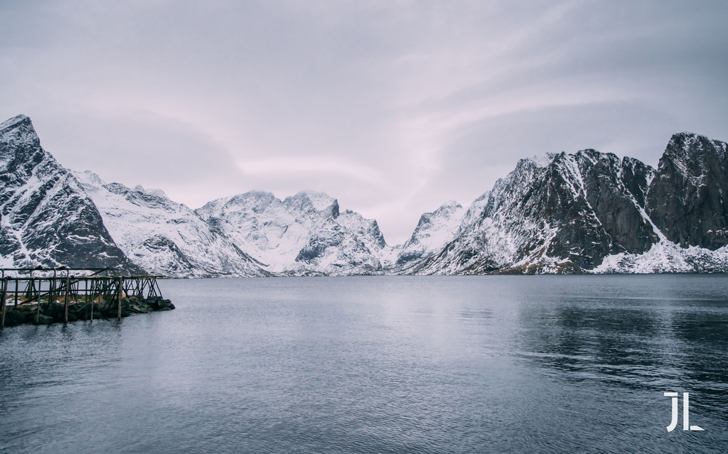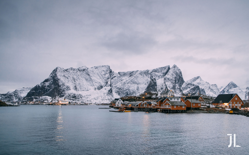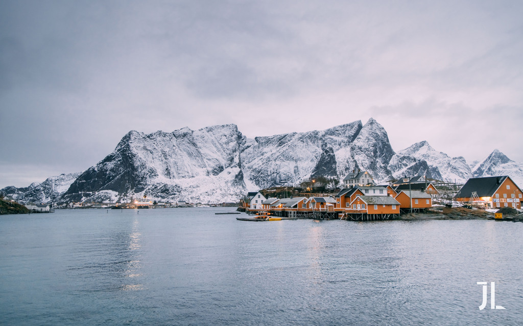 从亨宁斯韦尔离开,前往《孤独星球》封面的取景地雷讷。这里似乎已经成为了某种视觉符号,提起罗弗敦,便会出现那红白相间的小渔屋错落有致的建在沿海的峭壁上,背后是雪白的雪山。雷讷,这个名字在挪威语里意为“纯净”,它也正是如此,一面是波涛汹涌的挪威海,一面是像壁画般耸立的山峰,不沾任何世尘。