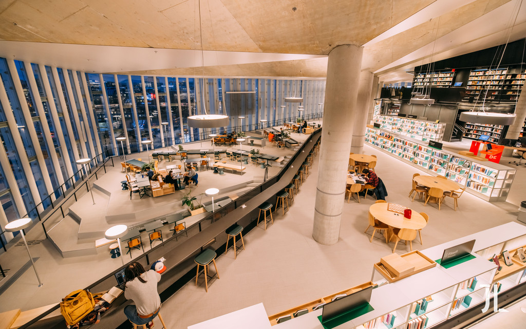 走出蒙克博物馆,天色似乎变得更加阴郁起来,虽然离开了罗弗敦,但冬令时下的奥斯陆,天黑的同样很早。我决定去蒙克博物馆边的奥斯陆图书馆看看。这并不是一个标准意义上的景点,我被其外观吸引,决定进去,想要缓解一下看完蒙克的画以后的情绪,同时看看以设计著称的北欧究竟是如何定位自己的图书馆。