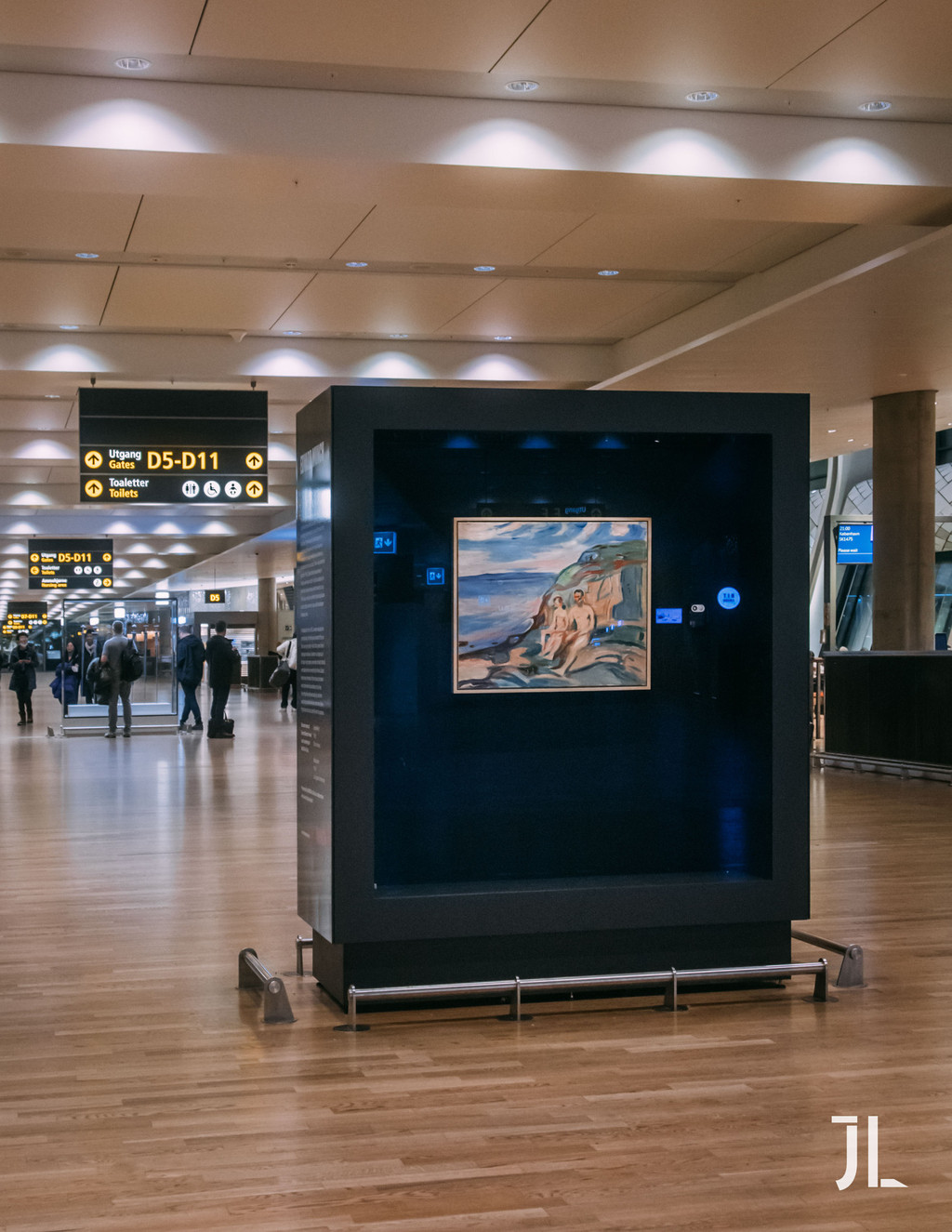 有意思的是,你能在奥斯陆的机场航站楼里看到几幅著名本地画家爱德华·蒙克,也就是创作《呐喊》的那位画家的真迹,还能看到不少属于维京民族的古老物件,使得从下飞机到取行李这一段原本漫长无趣的通道也变得有意思了很多。我不自觉的把所有展品挨个看了一遍,待到取行李处,我的行李已经待我多时。