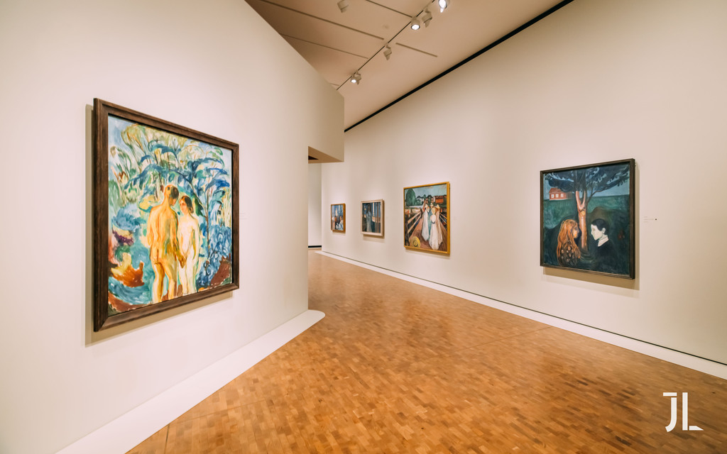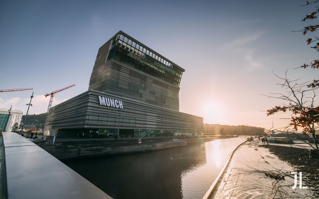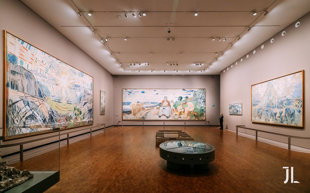 所以,我在奥斯陆的第一站,就去了位于奥斯陆歌剧院旁的蒙克博物馆(MUNCH)。那是一栋新建成没多久,通体银灰、直冲天际的建筑,几乎像是从峡湾里生长出来的现代纪念碑。馆内馆藏了两万多幅蒙克的原创艺术作品,甚至包含了一些信件,馆内展出超过二百幅蒙克原作,包括众多不同版本的《呐喊》原稿,《病中的女孩》,《马拉之死》,以及大型画作《生命之舞》系列。