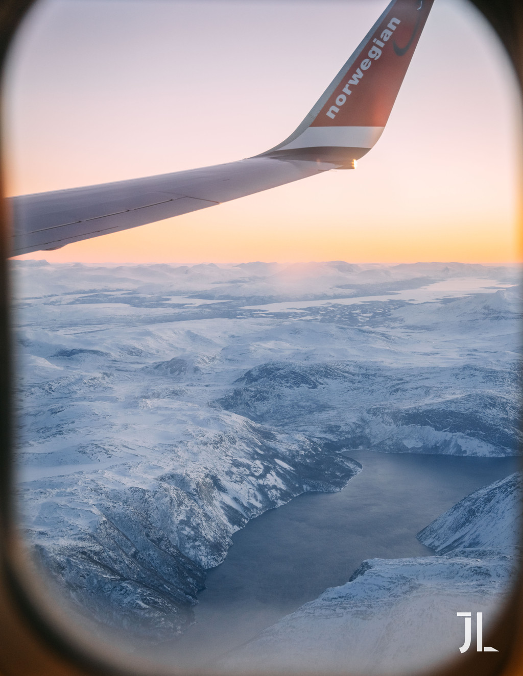 第二天的航班由挪威本土的航空公司执飞,于奥斯陆早上的8点55起飞,飞跃近两个小时,于10点35抵达罗弗敦依文内斯机场。飞机越靠近目的地,舷窗外的世界便越显得不真实,但是需要注意的是,罗弗敦的伊文内斯机场不仅仅是一个连接北极圈的小型民用机场,它同样是北约的军事设施。这意味着,当飞机即将抵达时,空乘会以一种不容置疑的语气提醒你:必须关闭遮光板,停止一切摄影。不是建议,是规定,哪怕是飞机落地滑行时。不要冒这个险,否则落地后迎来的并不会是北国的第一缕清冽空气,而是边防的审问甚至被拒绝入境的可能,一定要遵守规则。