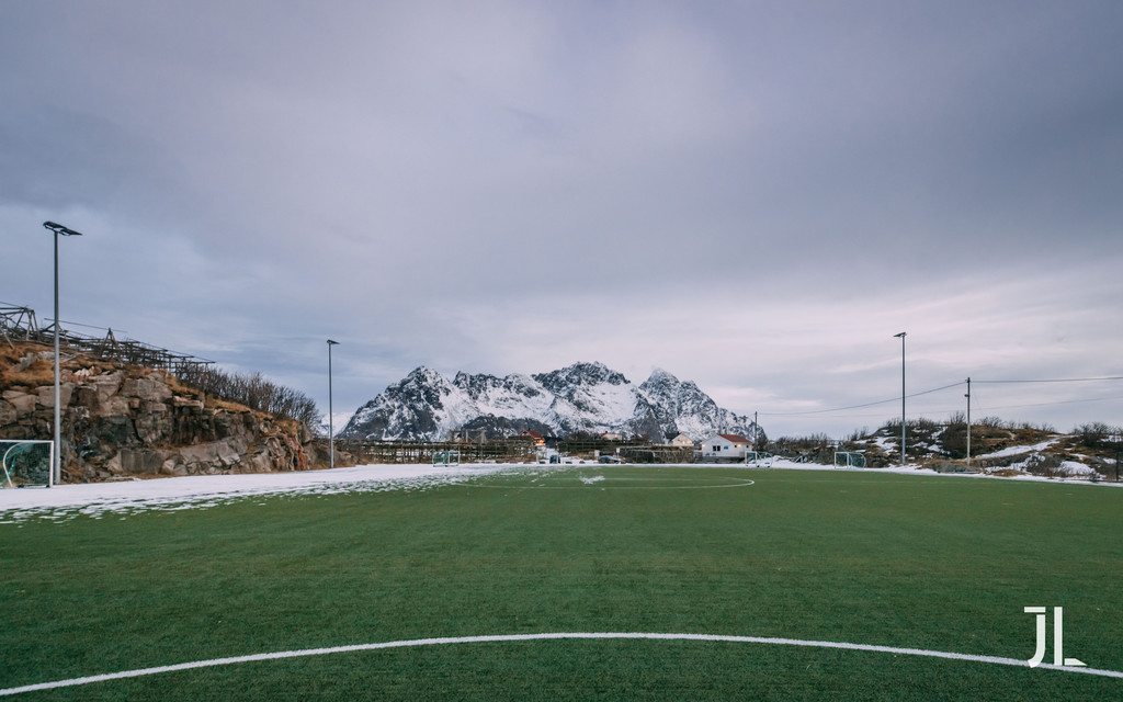 在度过北极圈的第二天后,我开始南下前往亨宁斯韦尔,天色开始真正沉下来。车沿着E10公路南行,路面湿滑,云层低垂,风像是直接从北极吹来,穿过山峦与峡湾,在车窗上留下一层无法抹去的凉意,这时,冬日多云天气的弊端开始显现,原本就不多的日光时间,天空被大片云朵遮蔽,让整个大地都变得黯淡下来,好在终于见到了最初吸引我的那个世界尽头的足球场足球场,那一抹绿实在耀眼,照散了心中的乌云。