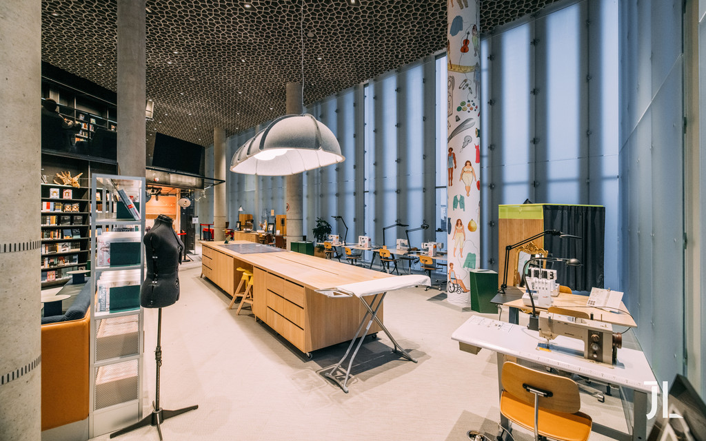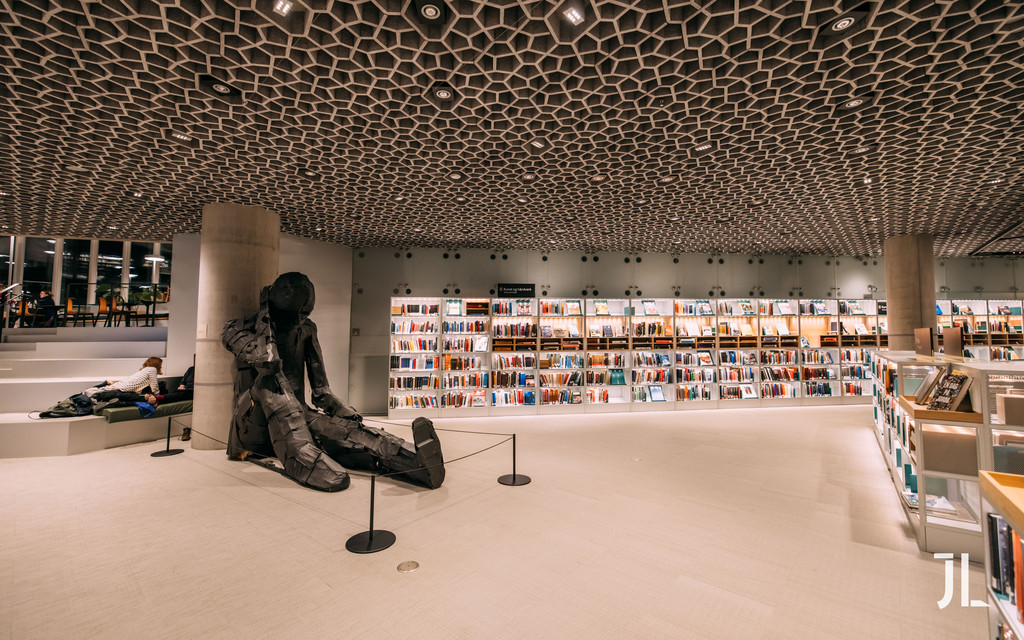 逛完之后还是受到了非常大的震撼,与国内的大部分图书馆有着很大的不同,它不再只是封闭的自习室和静默的书架,而是一处如同城市客厅般自由开放的场域。空间划分清晰却流动性强,光线被建筑巧妙引入,设计风格明显。除了自习室,阅读区之外,有大量的你可能意想不到的有趣空间。比如有大片的雕塑设计区,有着关于这座城市的历史介绍区,有关于胶片和地理的知识讲解区,还有3D打印区,裁缝区,以及博客录制区。偌大的图书馆仿佛就是一个巨大的兴趣盒子,激发着无论是大人还是孩子的探索,求知欲,实在是厉害。
