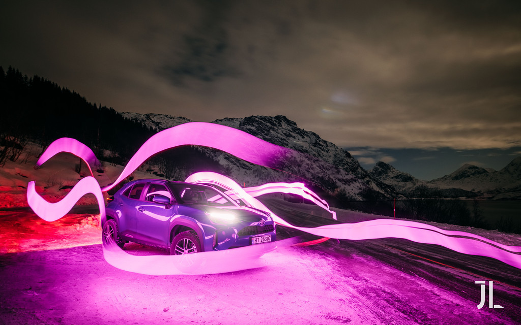 过了下午四点后,阳光便从天边悄然退场,不过我赶上了满月的那两天,于是月亮与太阳交换岗位,接过了照耀这世界的职责。全月光的照耀下,雪原、峡湾与被风雕刻过的山体线条被重新勾勒出来。或许从未感受过如此早的天黑,我驾着车一路驰骋,从海边到内陆,与山影和满月作伴,贪婪的吸收着这里的一切。到后面甚至还拿出了灯棒,在雪地与山体的前面创作起光绘,乐此不疲。