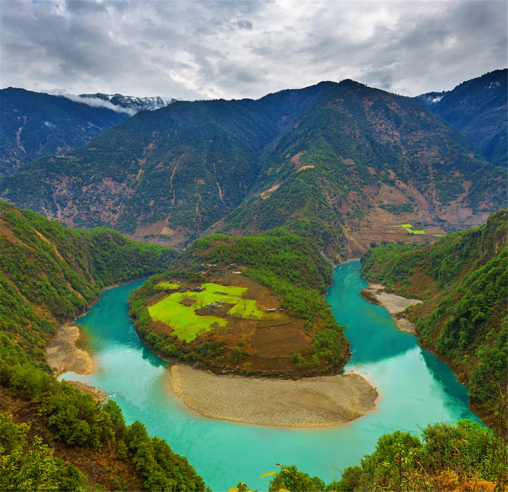 过了怒江第一湾,就到了丙中洛。站在观景台上,一边是人神共居之地——丙中洛。另一边是怒江上另一颗粉色宝石——桃花岛。丙中洛镇是一片比较平的坡地,四周被群山环抱,满目苍翠。放眼是美丽的田野风光。层层梯田一片金黄,阡陌田园之间,又是绿树丛林相间。一弯怒江沿着大山边缘,画了个弧线流向右方,真是分不清楚是“蓬莱仙阁”还是“人间仙境”。