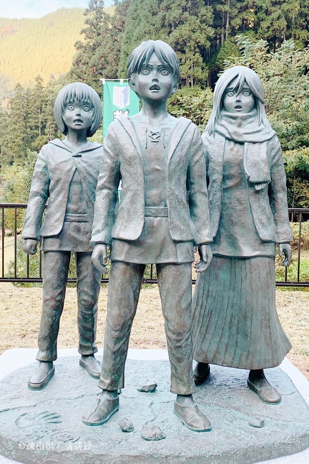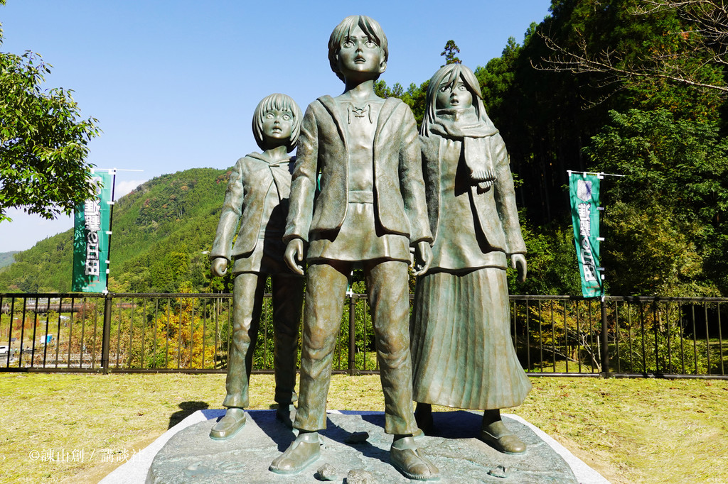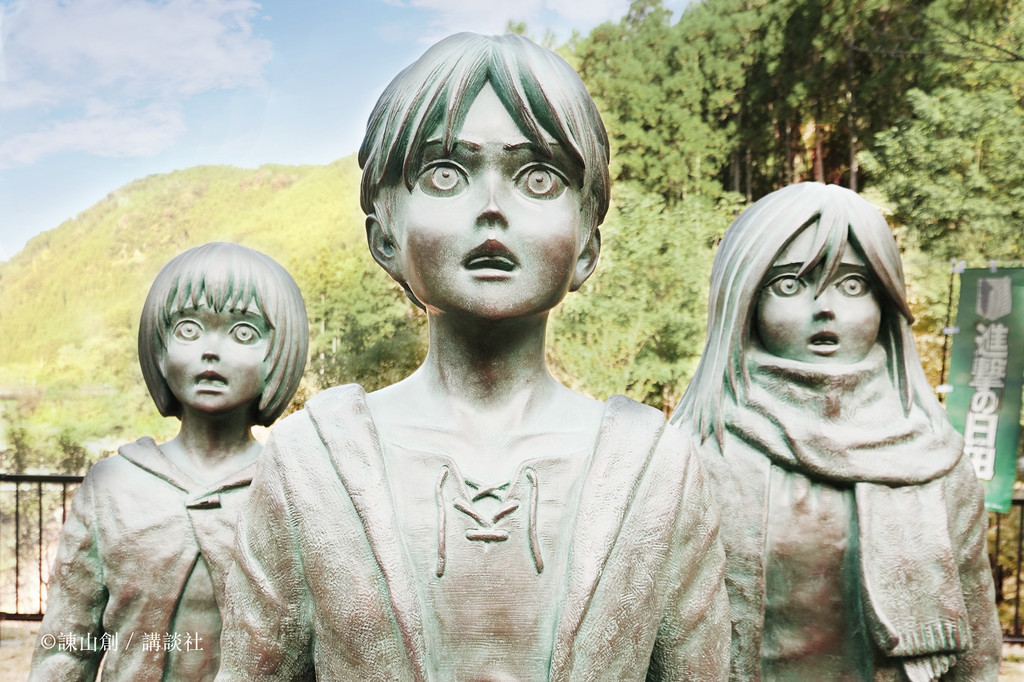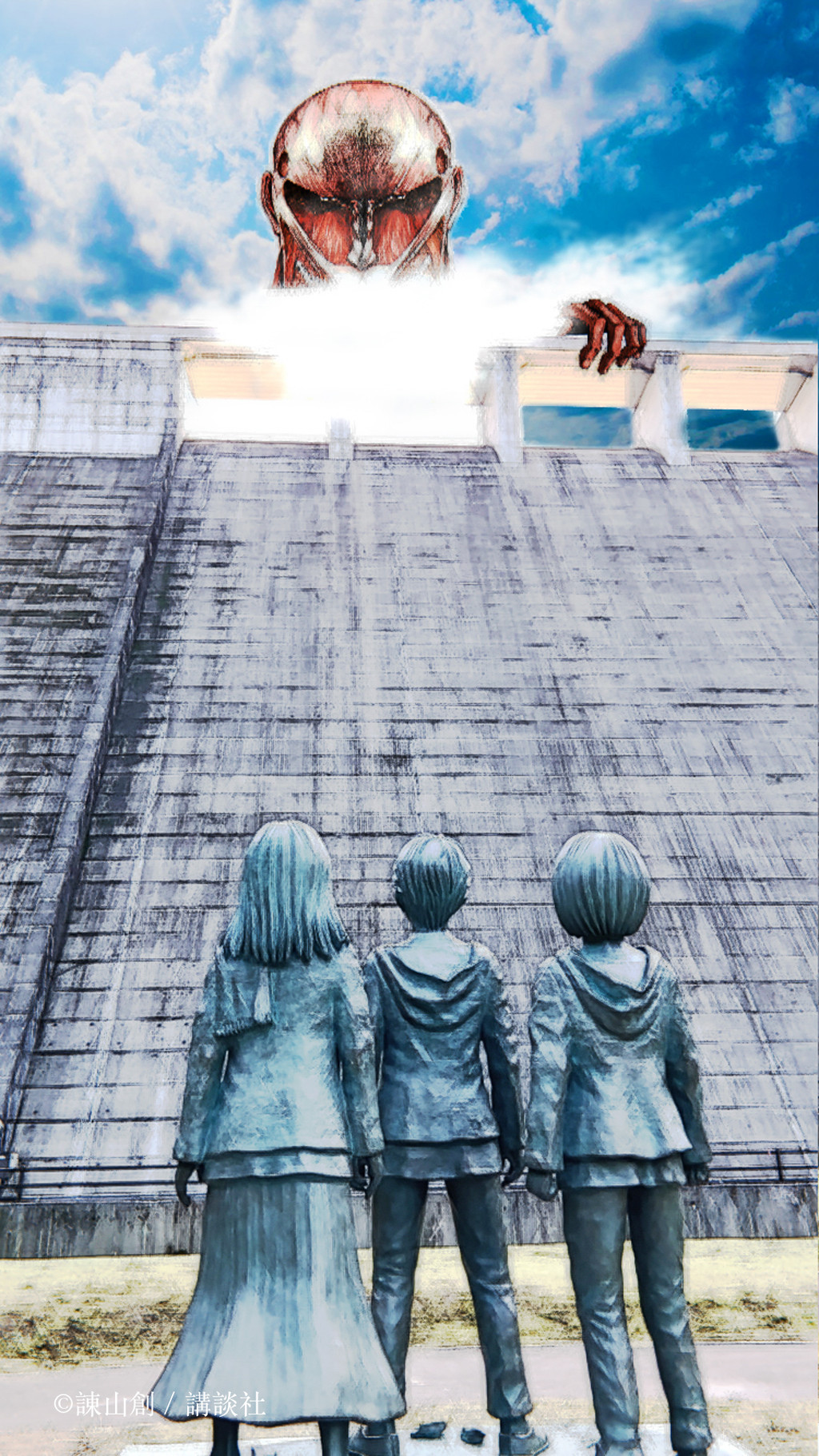 在日田市当地的大山大坝下游广场上,摆放着《进击的巨人》的主角——艾伦、三笠、阿尔敏等三人少年时期的铜像。三座铜像都是等身大小,而高达94m的大坝就像是作品中“保护人类的高墙”一样,整体上重现了主角三人组第一次见到巨人的场景。
