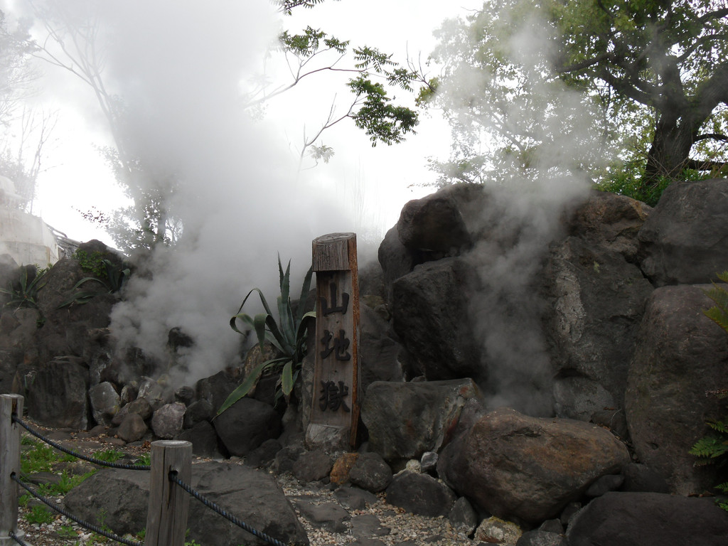 即使是现在,铁轮地区的温泉喷口依旧被称作“地狱”,总共有“海地狱”、“血池地狱”、“龙卷地狱”、“白池地狱”、“鬼石坊主地狱”、“鬼山地狱”、“灶地狱”等7处温泉。这7处“地狱”有着各自不同的特征,有的呈钴蓝色,有的呈鲜红色,而有的则会喷涌出豪迈的间歇泉。