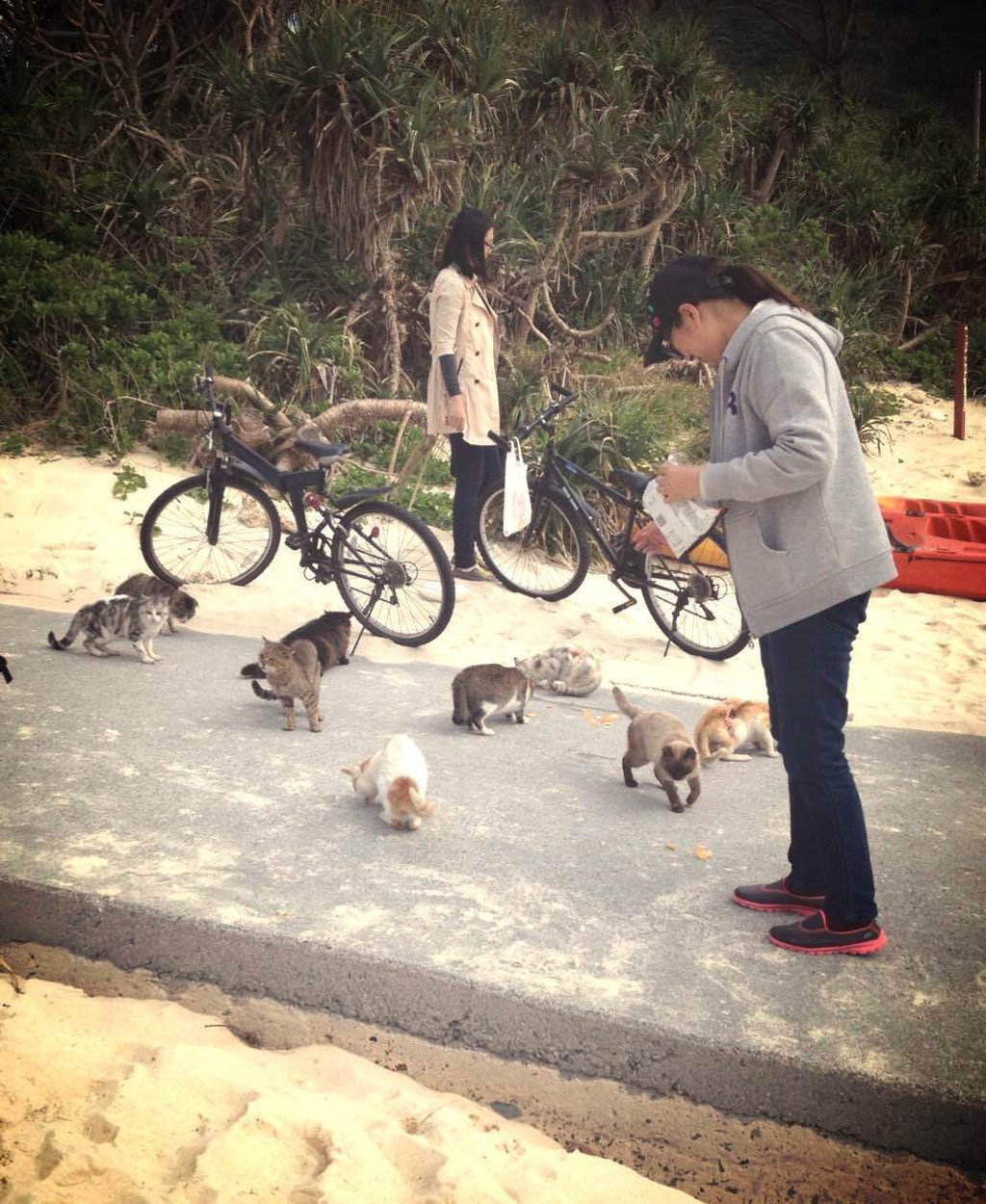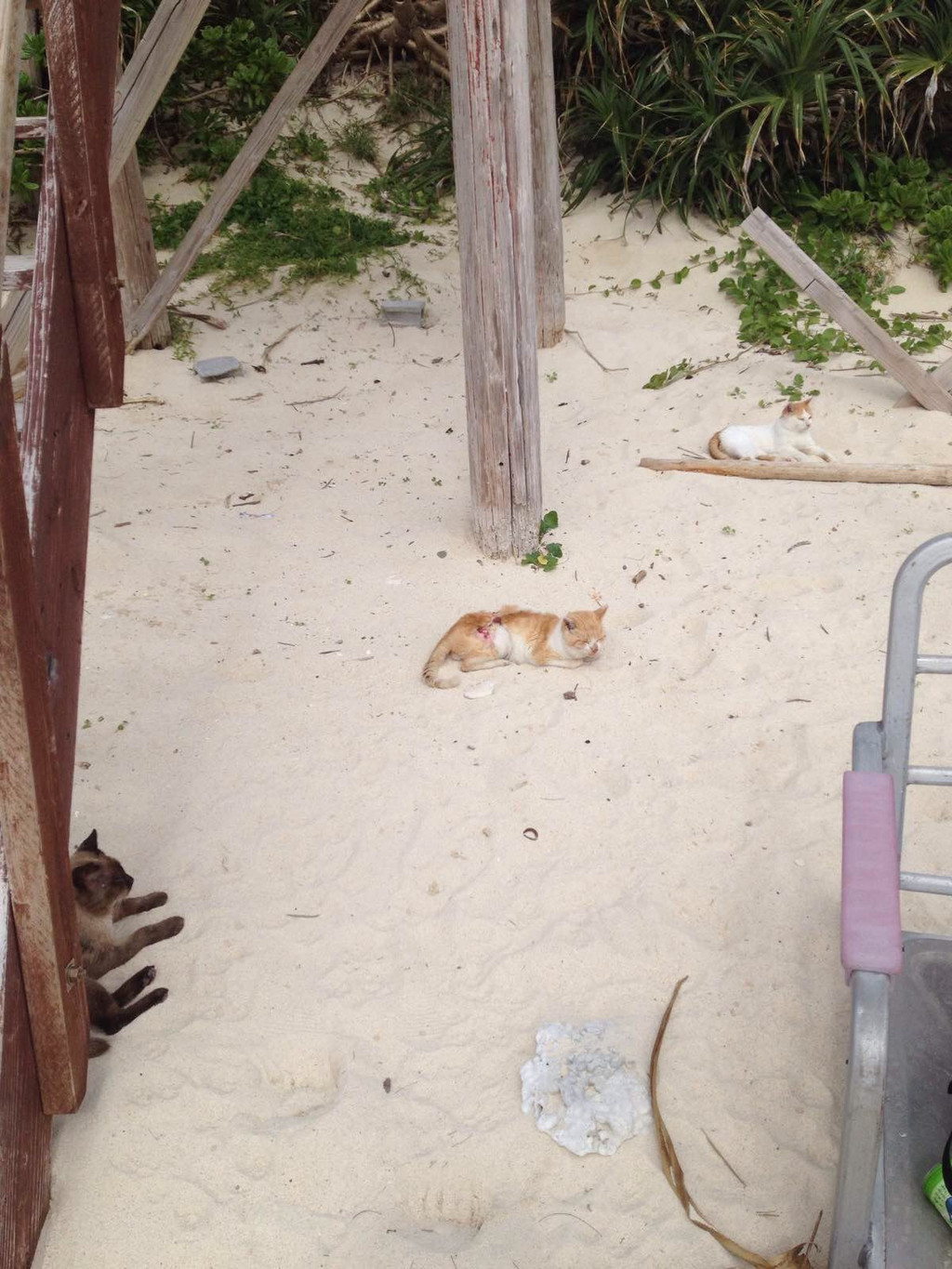 这只猫伤得一塌糊涂。据说是乌鸦啄的。看起来,岛上除了人没饿着,其他都饿极了。