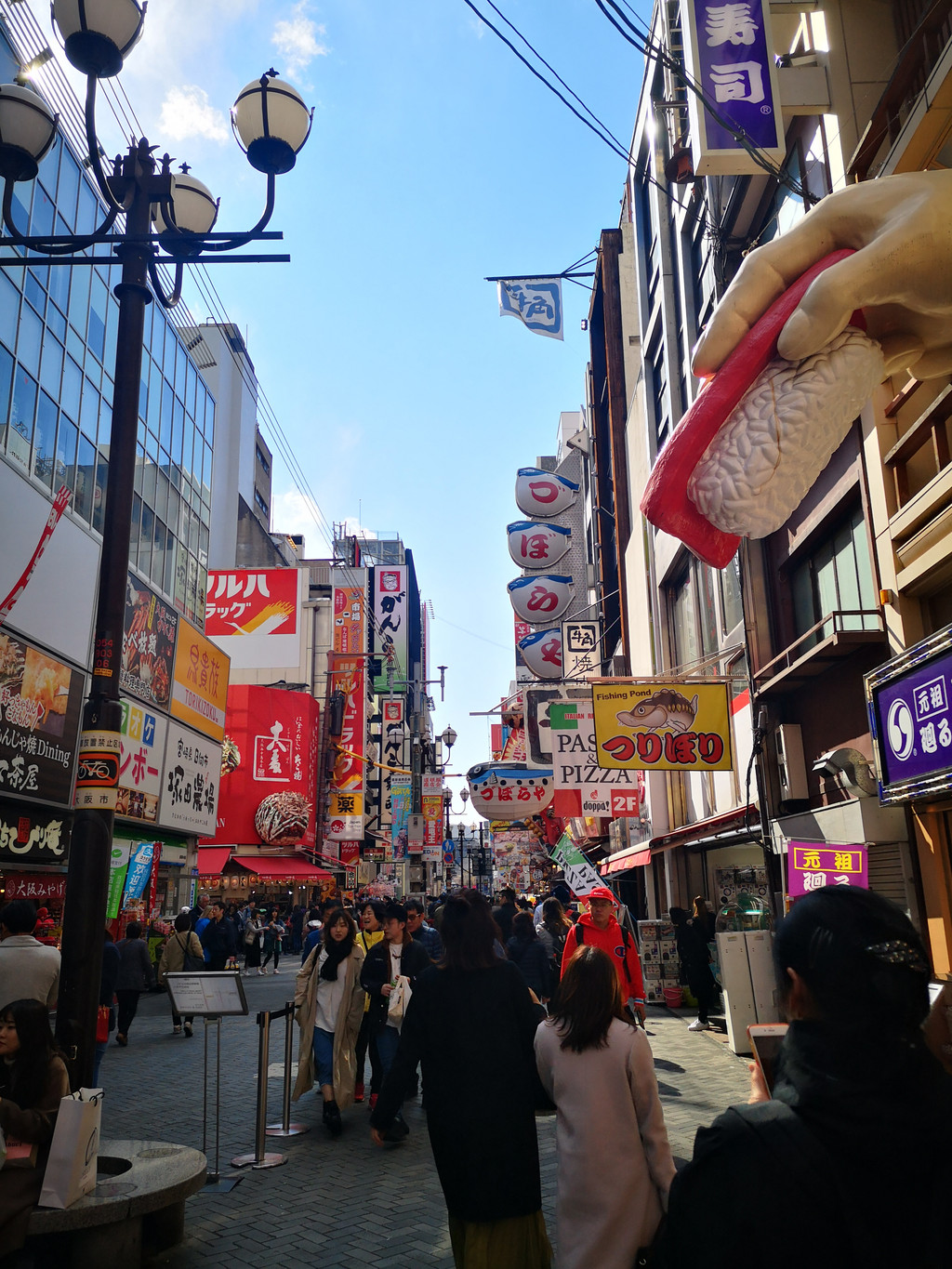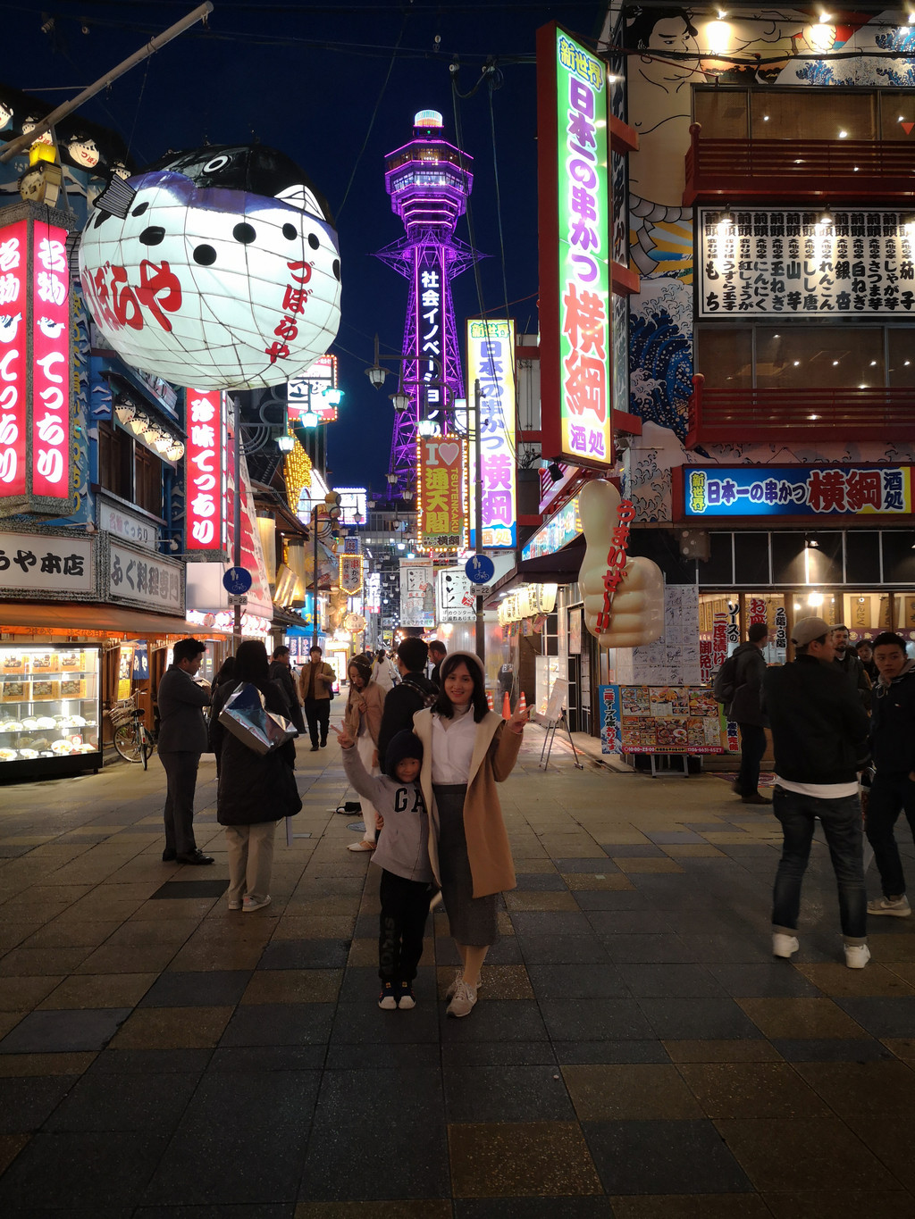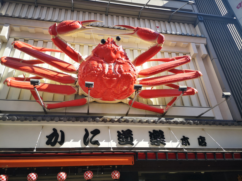 今天一天的行程基本上把自己的和别人的购物清单全部都买齐了,道顿堀和心斋桥真的是整个大阪城最最热闹的地方了吧,特别像韩国的明洞,哪哪都是国人,逛的吃的小店特别多。今天就特别体现我订的酒店位置的优势,商场百货店药妆店都离得特别近,每买一家店还可以把东西先运回酒店,再继续血拼gogogo。中午在著名网红店蟹道乐吃午餐,我在国内就通过官网订了座,所以到点去吃就不用排队。建议直接自己官网订,不要网上找人订给别人赚代订费,代订费还是按人头算的不便宜。道顿堀一条短短的街道就有三家蟹道乐,可见其网红程度。本来想订本店的,但我订的时候都已经满座了,只能订到中店下午14:00的位置,不过实际我们是13:30去的,也不用等就可以直接吃了。全蟹宴吃个新鲜还可以,但也不要报太大希望,必竟网红店总是不那么靠谱。我们几个人点了三个套餐,还感觉吃不饱,量真得太少了。吃完饭准备打卡名侦探柯南同款通天阁,在去的路上刚好路过bic cemera,又进去各种逛逛逛买买买,母亲大人也果真如愿以偿地拿下了电饭煲。刚地铁坐到通天阁,天空异象,开始电闪雷鸣,我们就躲进通天阁下面的章鱼小丸子店内避雨,没一会儿功夫马上雨过天晴太阳出来了。日本的海洋性气候也是出其的诡异,太阳雨是常有的事,天气预报基本不准,出门玩耍全靠运气哈。我们的运气还算不错。