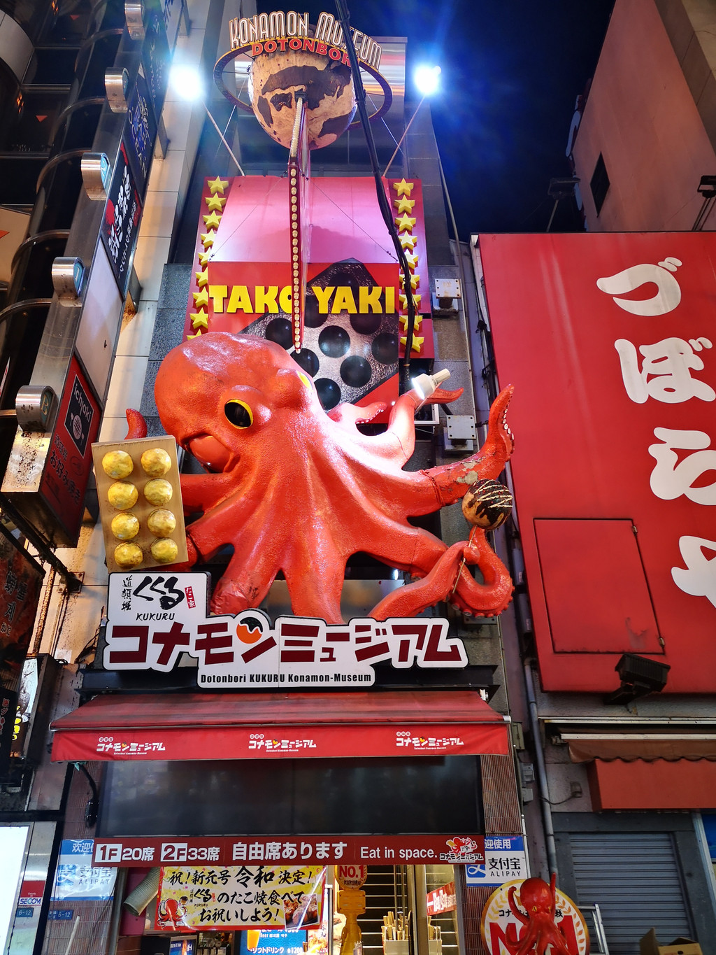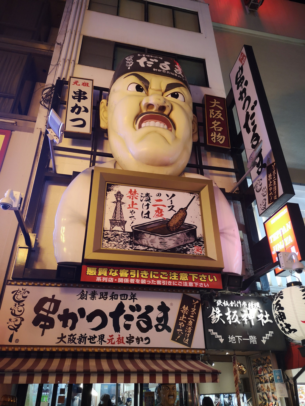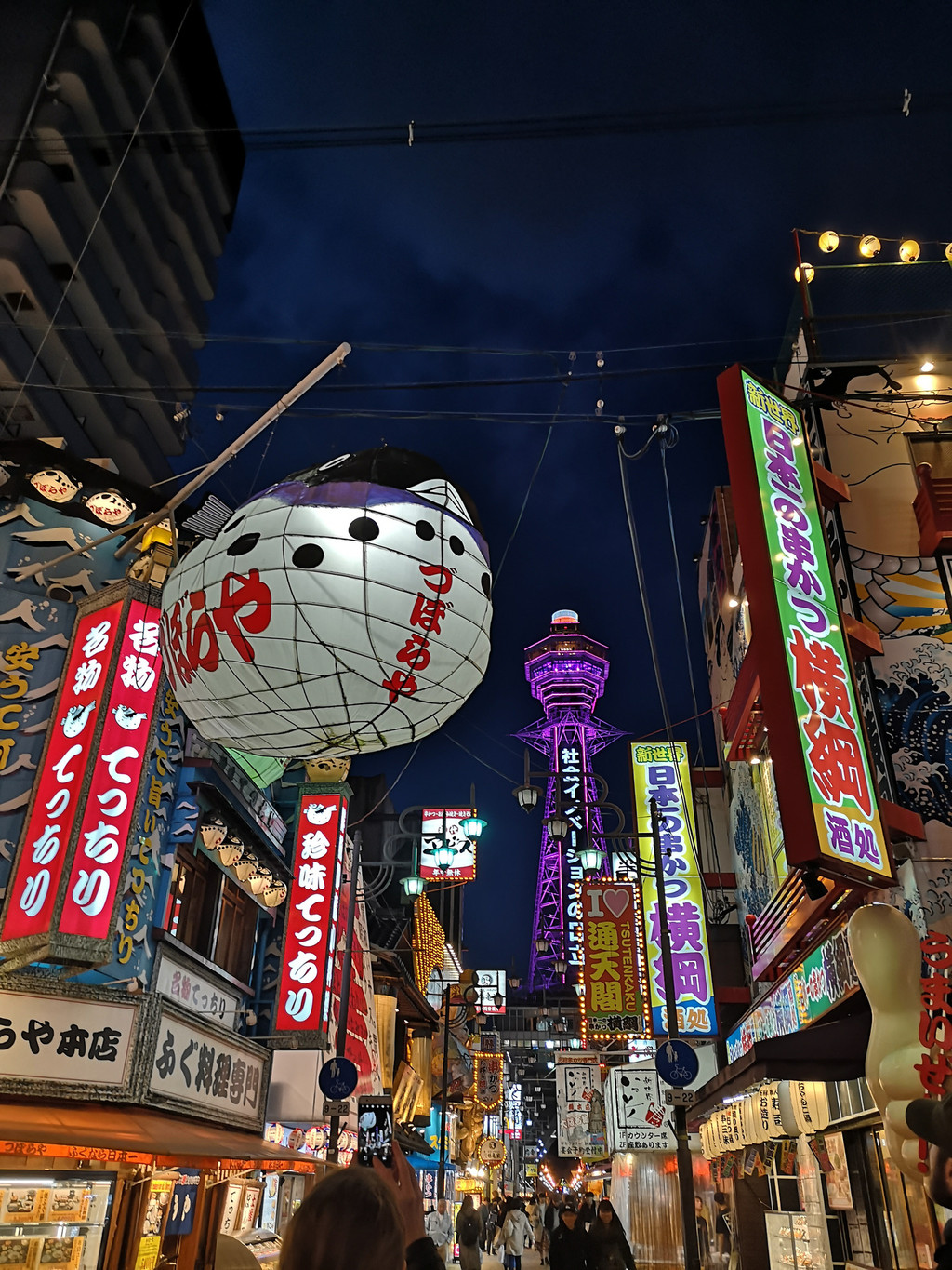 今天一天的行程基本上把自己的和别人的购物清单全部都买齐了,道顿堀和心斋桥真的是整个大阪城最最热闹的地方了吧,特别像韩国的明洞,哪哪都是国人,逛的吃的小店特别多。今天就特别体现我订的酒店位置的优势,商场百货店药妆店都离得特别近,每买一家店还可以把东西先运回酒店,再继续血拼gogogo。中午在著名网红店蟹道乐吃午餐,我在国内就通过官网订了座,所以到点去吃就不用排队。建议直接自己官网订,不要网上找人订给别人赚代订费,代订费还是按人头算的不便宜。道顿堀一条短短的街道就有三家蟹道乐,可见其网红程度。本来想订本店的,但我订的时候都已经满座了,只能订到中店下午14:00的位置,不过实际我们是13:30去的,也不用等就可以直接吃了。全蟹宴吃个新鲜还可以,但也不要报太大希望,必竟网红店总是不那么靠谱。我们几个人点了三个套餐,还感觉吃不饱,量真得太少了。吃完饭准备打卡名侦探柯南同款通天阁,在去的路上刚好路过bic cemera,又进去各种逛逛逛买买买,母亲大人也果真如愿以偿地拿下了电饭煲。刚地铁坐到通天阁,天空异象,开始电闪雷鸣,我们就躲进通天阁下面的章鱼小丸子店内避雨,没一会儿功夫马上雨过天晴太阳出来了。日本的海洋性气候也是出其的诡异,太阳雨是常有的事,天气预报基本不准,出门玩耍全靠运气哈。我们的运气还算不错。
