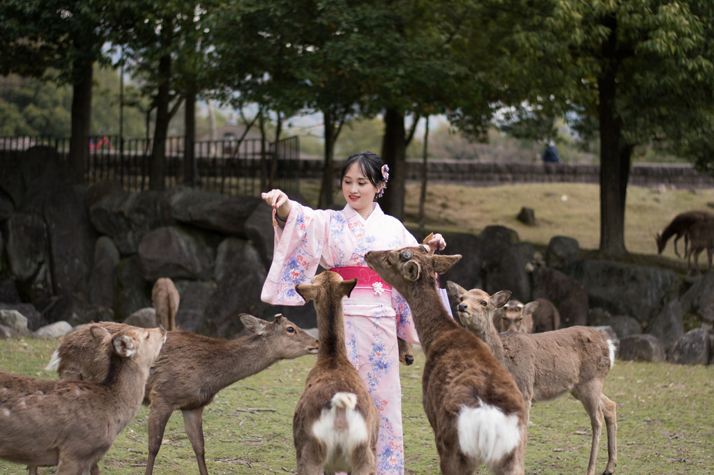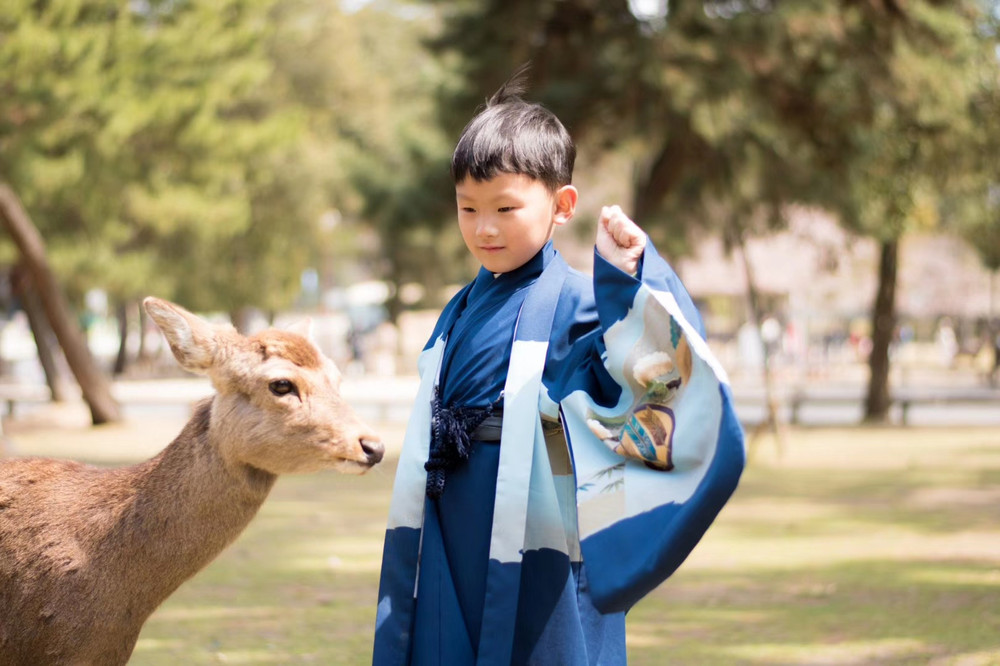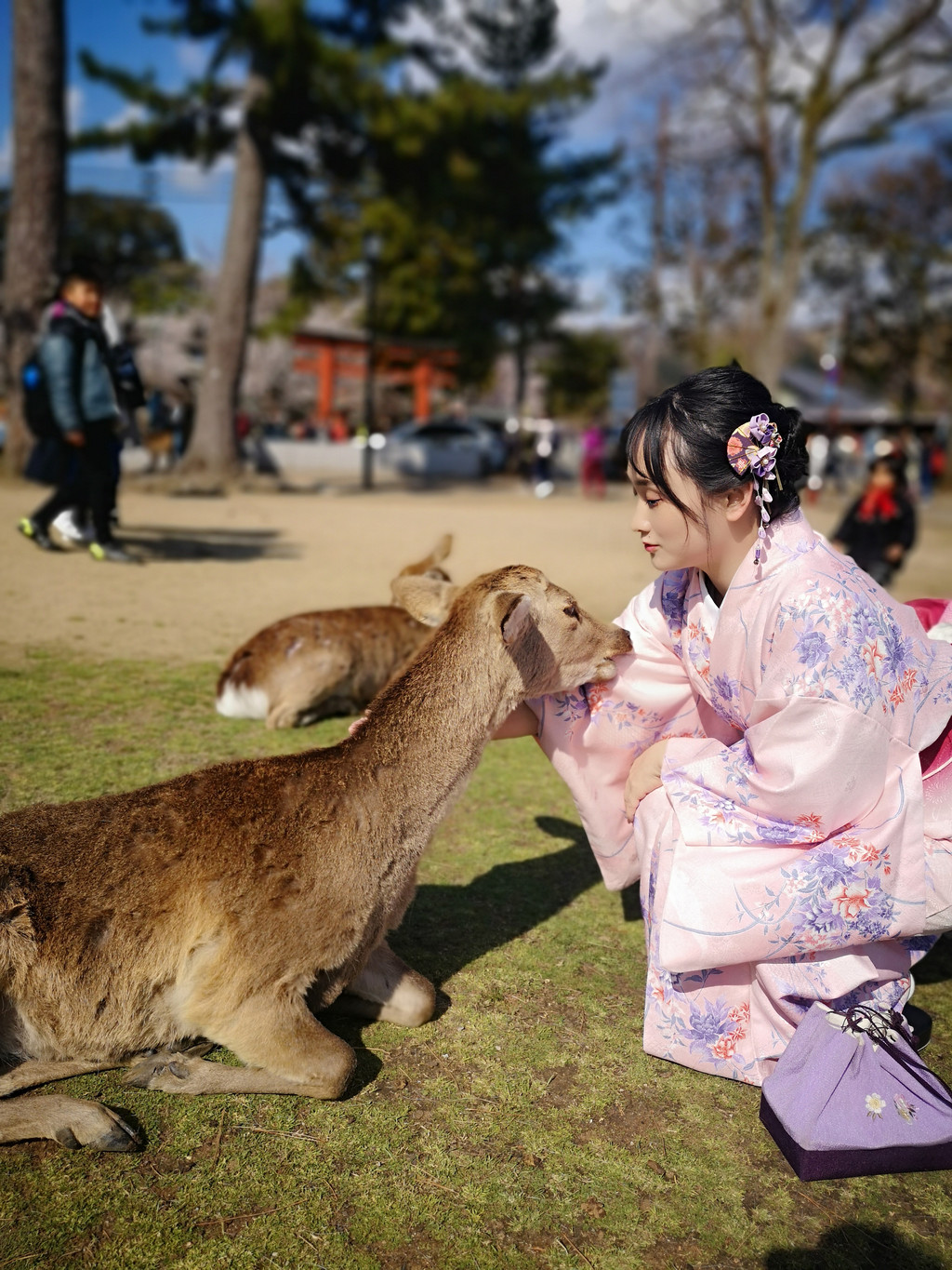 和服换装也是来岛国必体验项目之一吧,为什么选择奈良不选择京都,是因为考虑到京都人多,奈良换装的人相对少点。在网上找的店家,在国内就可以预约,店家是山东人,人蛮好的,预订也不用付订金。京都去奈良直接在京都站坐近铁奈良线很方便,当然JR也能到奈良,但近铁站离游玩的奈良公园更近一点。近铁奈良也和南海电铁一样,有特急、急行差别,看需要自行选择即可。我们刷icoca卡进去,上了特急车,结果列车员就会过来要我们补座位费。所以刷卡的只能坐急行,特急要去窗口买票。再说一说奈良的小鹿吧,大多数时候还是蛮温顺的,只要你不淘出鹿饼,它们对你爱理不理,绝对的现实派,一但看见鹿饼就会热情的跟着你,你不给就会蹭屁股咬衣服,各种卖萌,而且它们还喜欢欺负小孩子,有一只可恶的小鹿还莫明其妙跑过来踢了光哥一脚,光哥再去追它就飞快地逃跑了,好好笑。鹿饼150日元/袋。奈良公园很大,有个我爱的大草坪,有当地的小学生在这里郊游,加上小鹿、樱花树,整个画面不要太美,可惜我光顾着欣赏美景忘了拍照。春日大社和东大寺也都在奈良公园附近,都可以一起游玩,日本的神社看多了感觉都差不多,去一两个认识一下就好。据说冰室神社樱花开得很好,但有点距离就没去。这次因为带着小朋友,我们走得景点都不多,去哪都比较随缘,反正我相信下次还会再来哈。