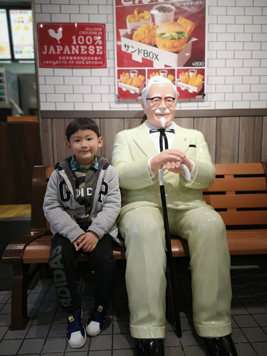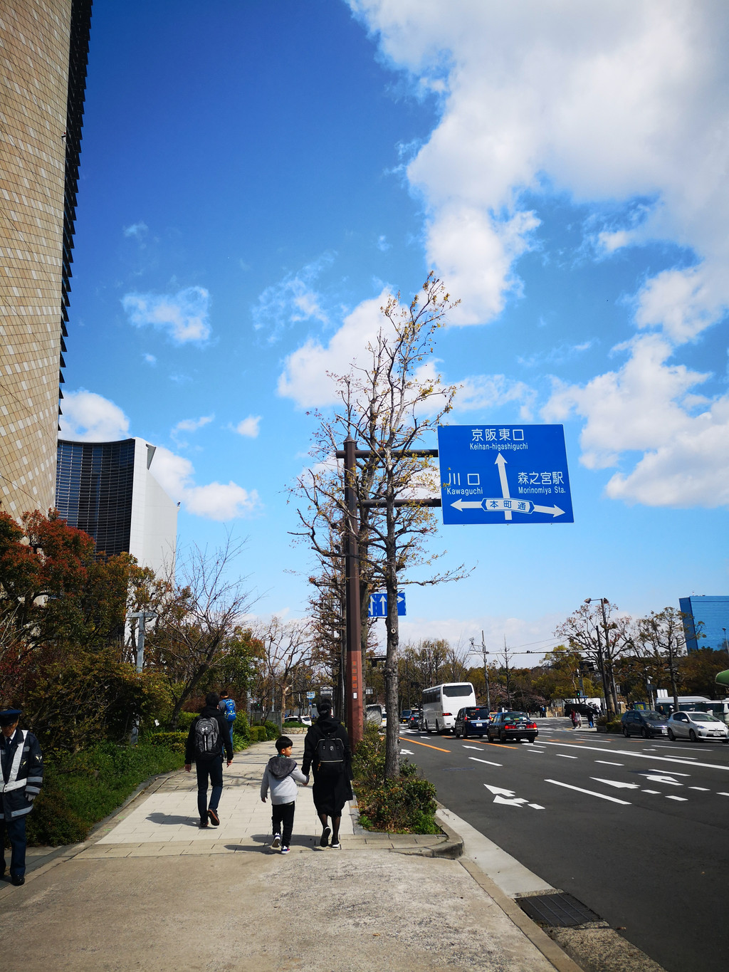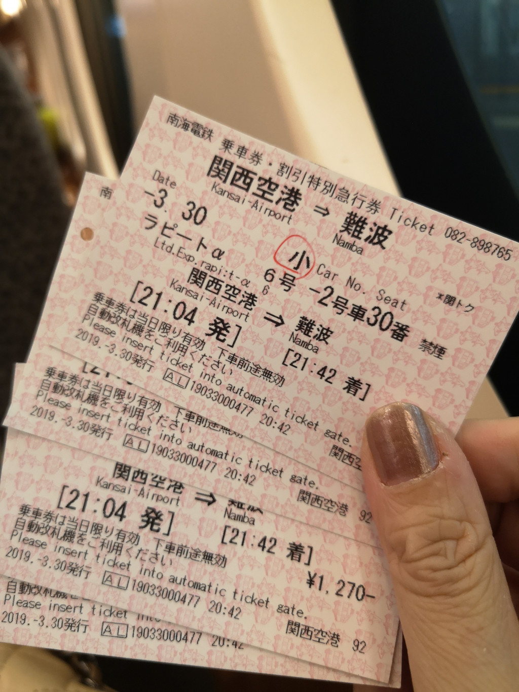 因为拖家带口行李又比较多,所以萧山机场选择自驾前往。下午16:25的航班,一整天的行程也不会太赶,飞机也没有延误,全日空的服务确实不错,还送了小朋友小礼物,机上的餐食也比国内航空要好,就是不知是天气原因还是飞行员技术问题,飞机降落的时候坐得我有点晕机。入关出奇的顺利,已经做好樱花季入关排长队的准备,结果是完全不用排队。关于机场到酒店的交通,原本是打算订接送机的,一开始机场到大阪市区包车500多点,后来等我观望一段时间后想预订的时候发现涨到六七百了,就索性不订了,网上攻略了下,发现到难波地区南海电铁可以直达。我们买了特急班车,有固定座位的,大人1270日元/人,小孩半价,三大一小算下来才付了270RMB,比接送机便宜好多,还有更便宜的没有固定座位的班次可以选择,价格好像是900日元多点,乘车时间也就多十分钟左右。下飞机后大阪城在下雨,这也是我们这次行程中唯一用到雨具的一天。到难波站后步行大约10分钟左右就能到道顿堀酒店,酒店位置很好找,跟着google走看到门口有四个雕像的就是了,晚上十点左右顺利入住酒店。