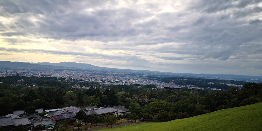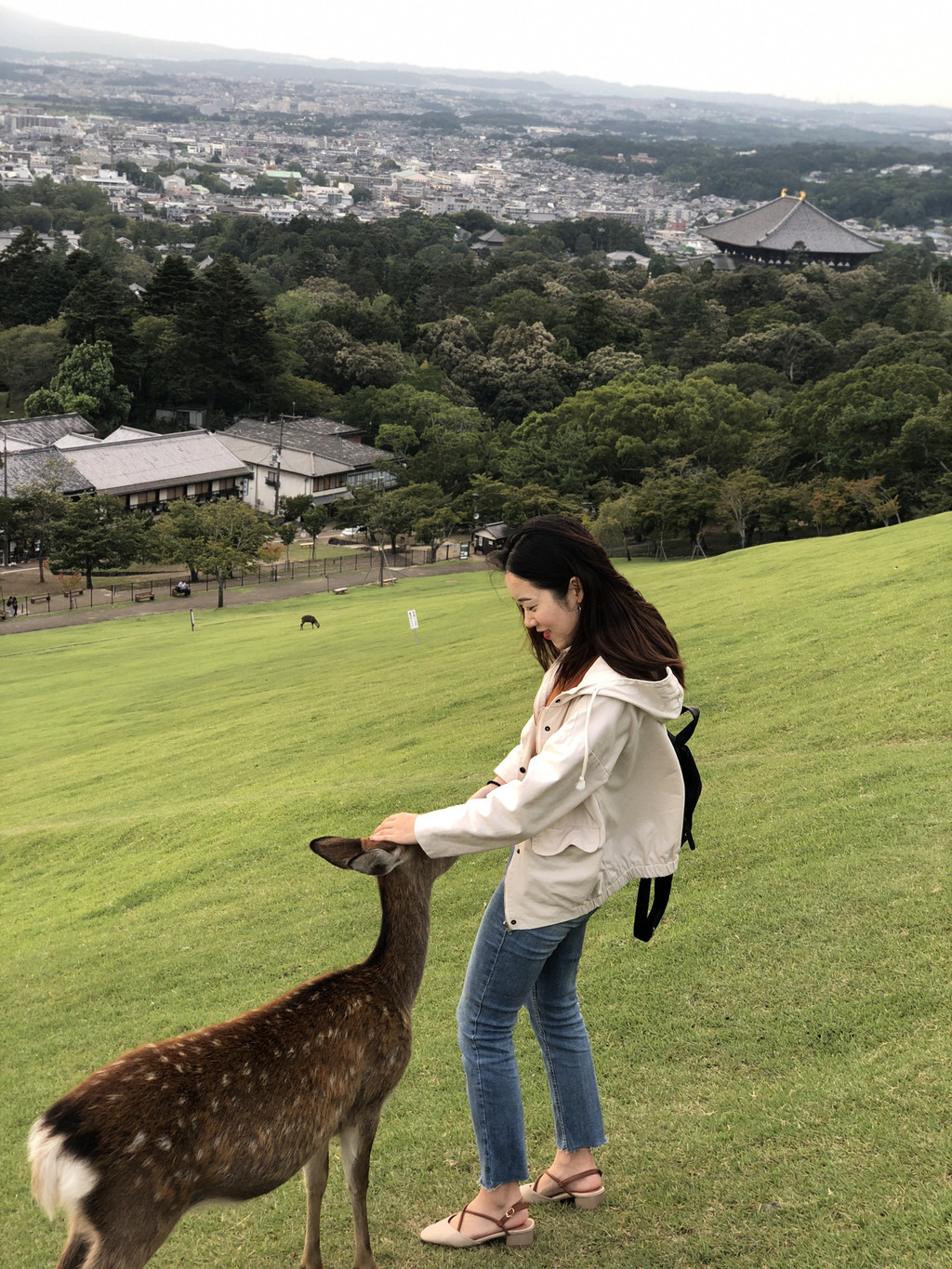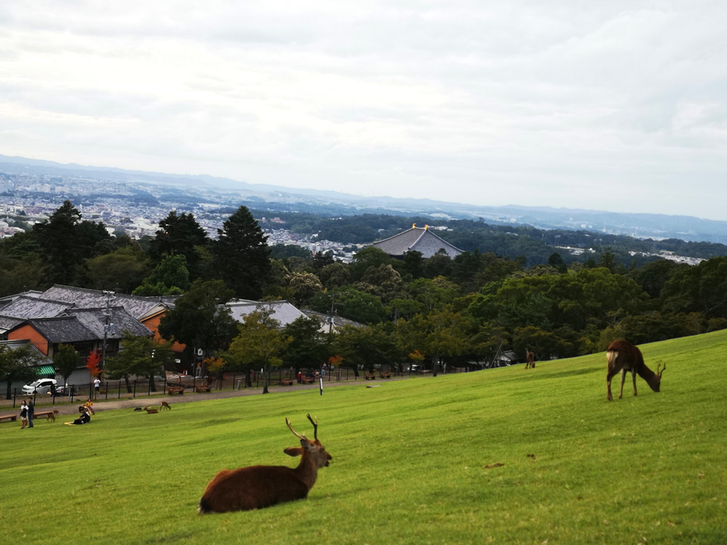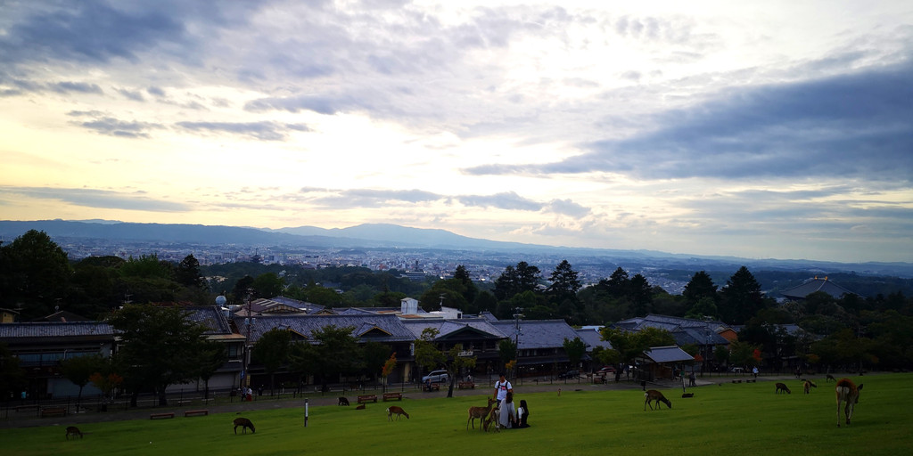推荐大家一个拍照的好去处,若草山。整片绿绿的草地,好多小鹿在园内找你要草饼。奈良公园北面有一条石子路,往里直走看见春日大社后往左拐,路过一个很大的停车场再往里走就能找到若草山。门票很便宜,地方比较小众没啥人,所以拍出的照片特别美,很森系。还能在山坡上望到奈良市全景,我去的时候是傍晚,夕阳下的城市还是比较壮观的。