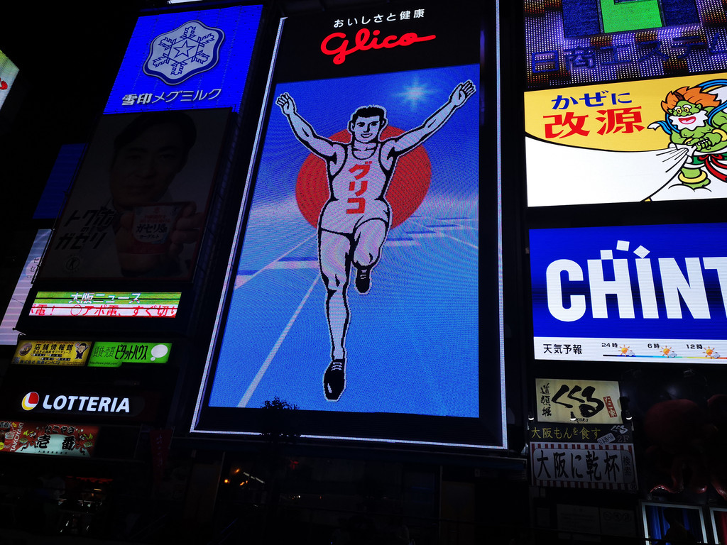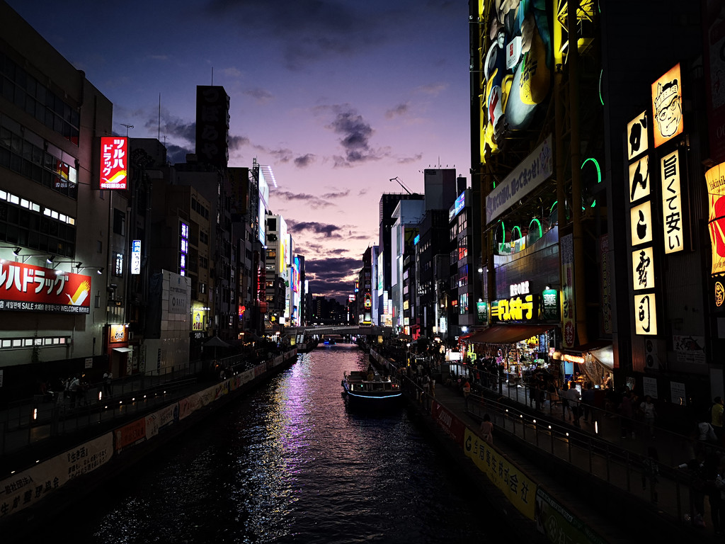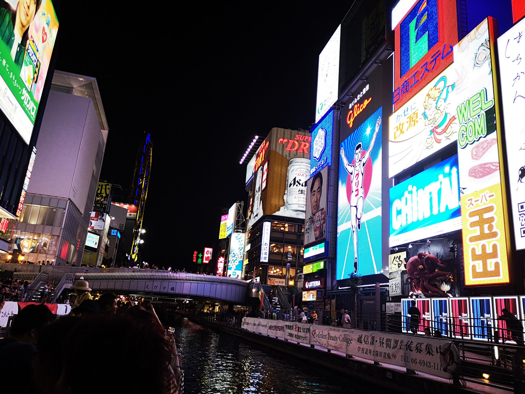 道顿崛跟心斋桥在一块儿,简直是购物天堂,女人的天性一头扎进化妆品店疯狂采买不可自拔,看什么都新鲜好奇都想要。买了六点的船票打算坐船游道顿崛,黄昏的夕阳与炫彩斑斓的霓虹灯融合在了一起,摩天轮亮起了灯,章鱼烧家的章鱼广告牌会喷水,格力高的广告牌上小人儿一直在奔跑…