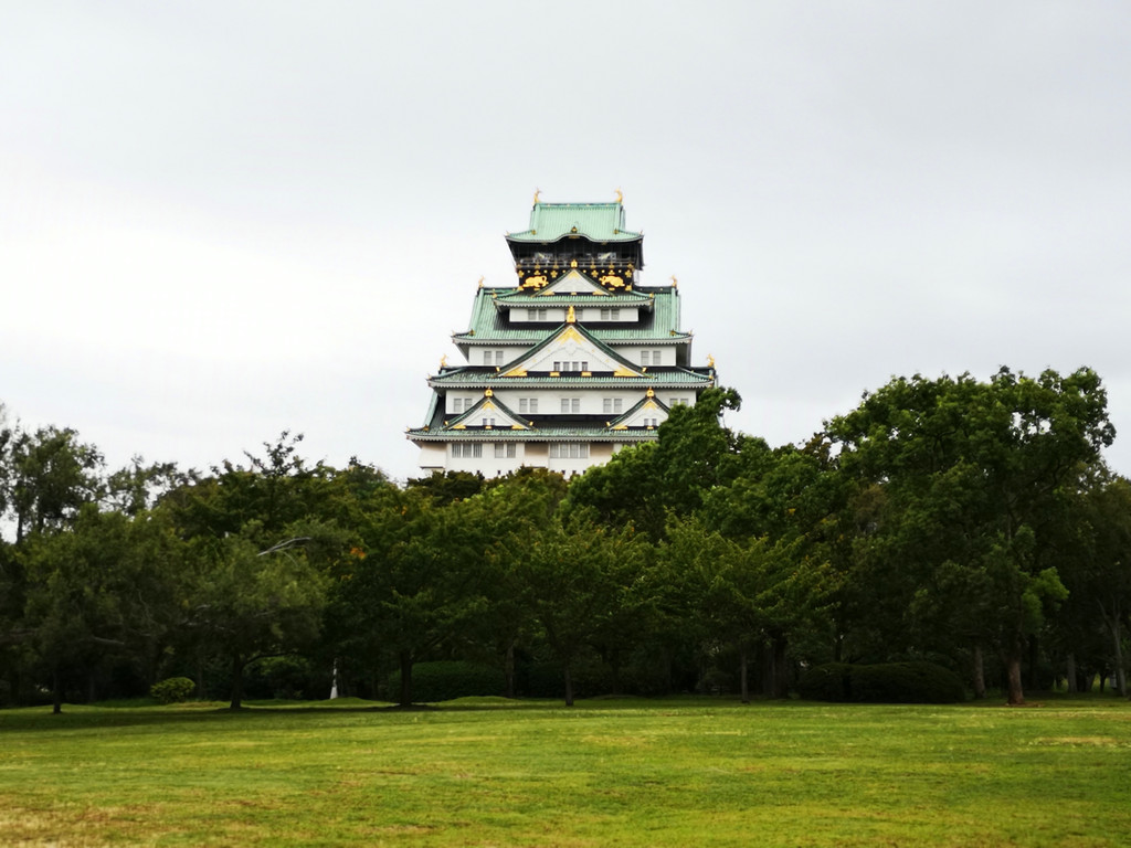 以为大阪城很小,就一个绿色瓦片的天守阁,江户时代是一方霸主,占山为城,还挖了很宽的护城河。在天守阁阁楼顶能望见整个大阪城,给标注了各个方向的标志性建筑,后来发现我们基本都走了一遍。