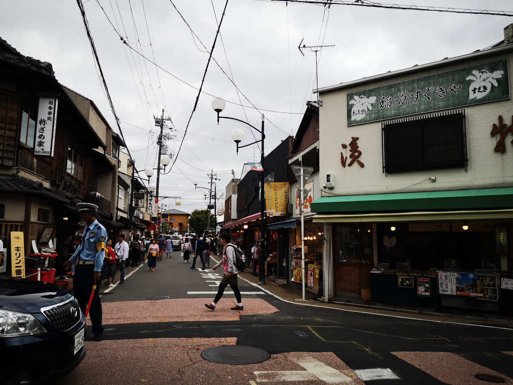 第一站伏见稻荷大社,千本鸟居也在这里。近铁伏见稻荷大社站很有特色,一出站台就能感觉到神社的气息,站台都是古式建筑。随着人流往前走,不怕找不到入口。日本地上轨道交通很发达,相应的在路口就经常碰到等电铁通过的红路灯,特别是在京都。前方路口红灯,叮叮叮声响起,栏杆放下,过了一会儿电铁疾驰而来。等电铁开过道路又畅通起来,车流人流继续前行,此刻有多少日漫里的相关片段一股脑儿的砸过来,小镇风光鲜明不已。上山的道路两旁全是小吃店,卖鱿鱼的、铁板烧的、抹茶味冰淇淋的,给我们馋的迈不动步子。