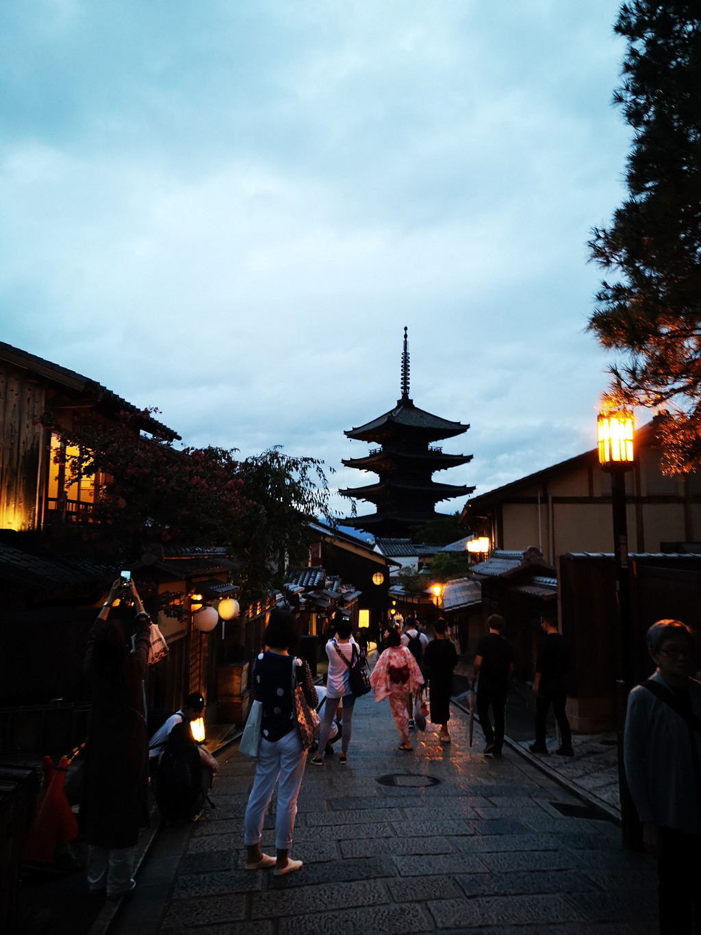 特别迷京都的风格,低矮的双层木式建筑,鸭川两旁的灯笼在风中轻轻摇曳,仿佛带我回到了盛唐的民间。吃饱喝足,优哉游哉逛去八坂神社欣赏夜景,看那几排摇曳的灯笼,与对面马路上的车水马龙~