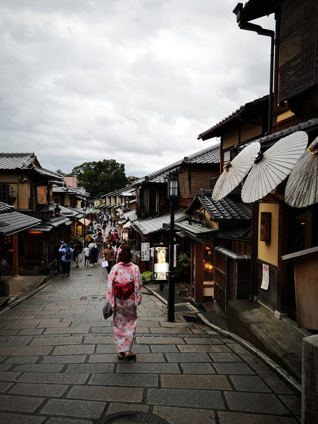 清水寺在山上,三年坂二年坂在山坡,穿着和服和木屐爬坡累到喘气,所以最好穿自己的鞋子,把木屐放口袋里拍照的时候拿出来搭哦。
