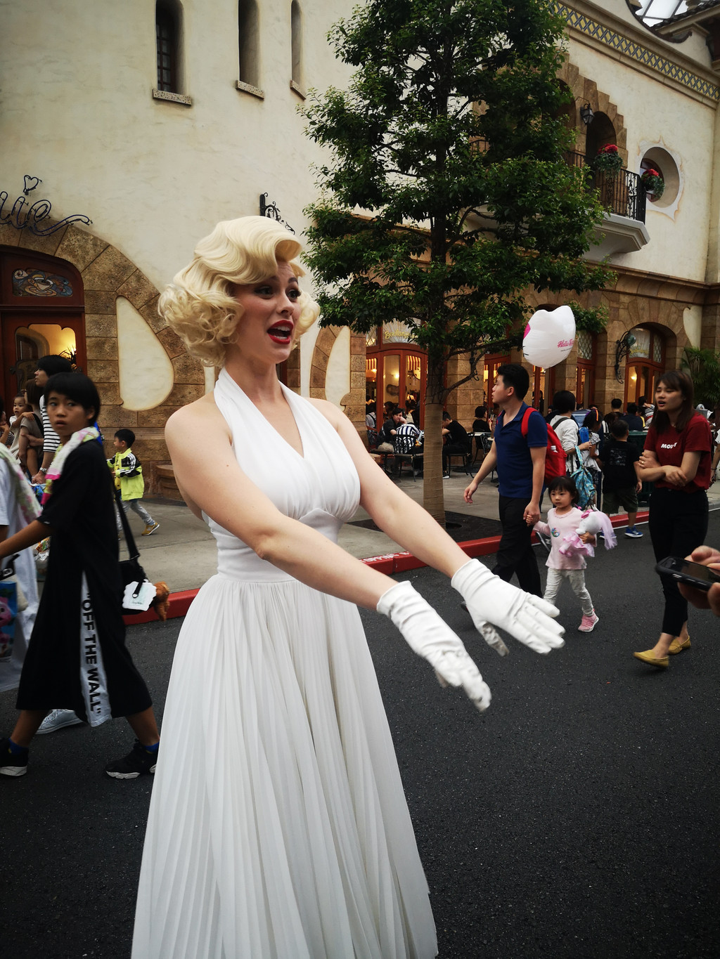 在日本环球影城实在难得看到一个白人面孔,所有的NPC都是日本人扮演的,很多地方有有点违和。好不容易逮到了梦露姐姐,兴冲冲跑去跟她合影,结果耽误她站位了,拉着我到处跑。
