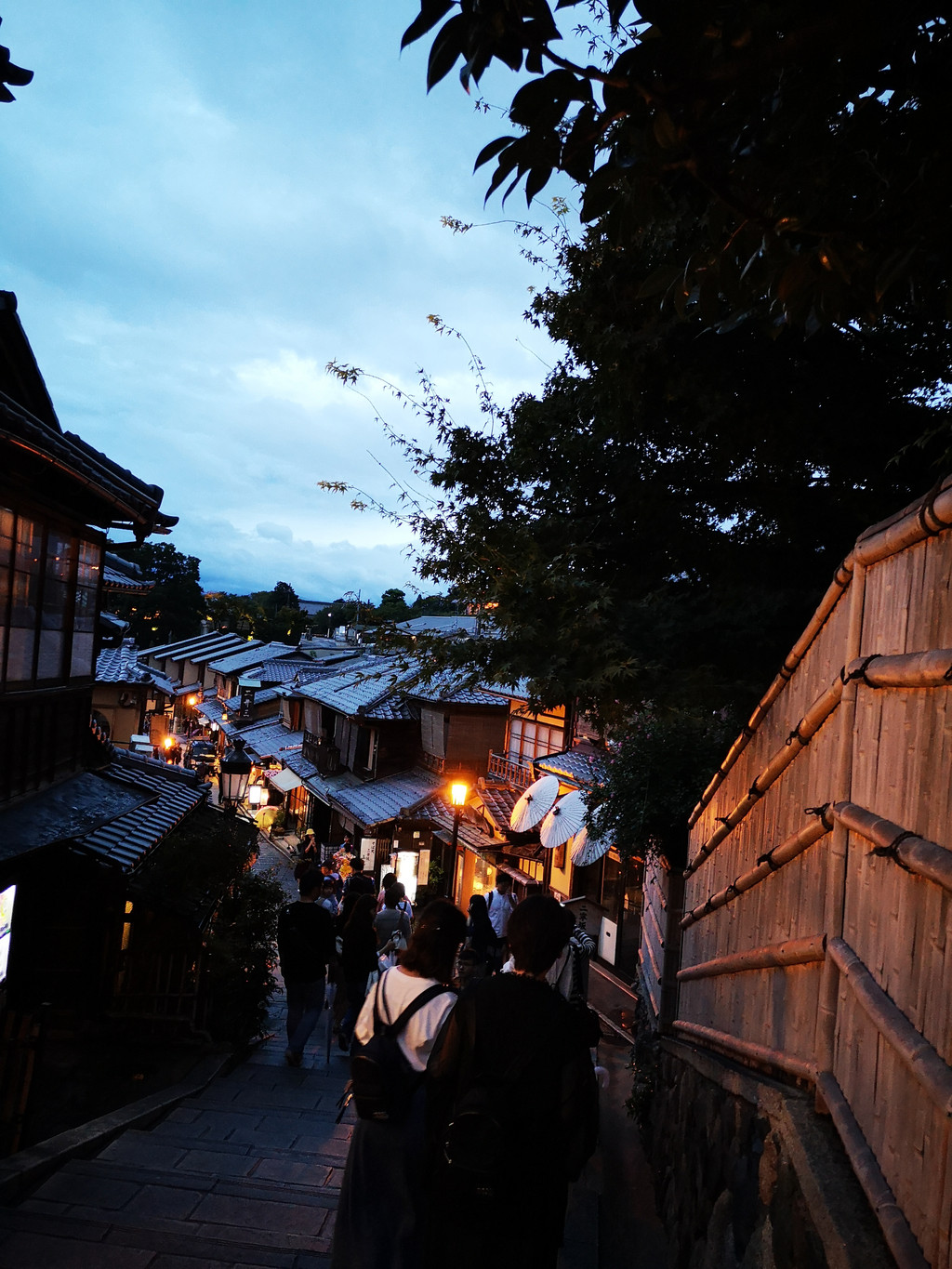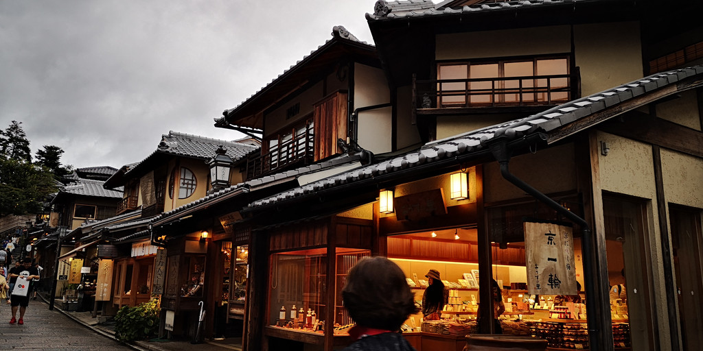 高台寺是在漫无目的的游荡中找到的,走在纵横交织的小道中,不靠导航是肯定要迷路的~但既然是自由行,那就让一切都随意点。在夜幕来临前的昏黄灯光下,我们偶遇了高台寺,往高台寺的北面走是一个小山坡,视野开阔,今天没有夕阳,但在灯光掩映下的景色也特别美。这时候那些个旅游团都因为行程安排或大雨离开了,独留我们在京都欣赏夜色温柔。