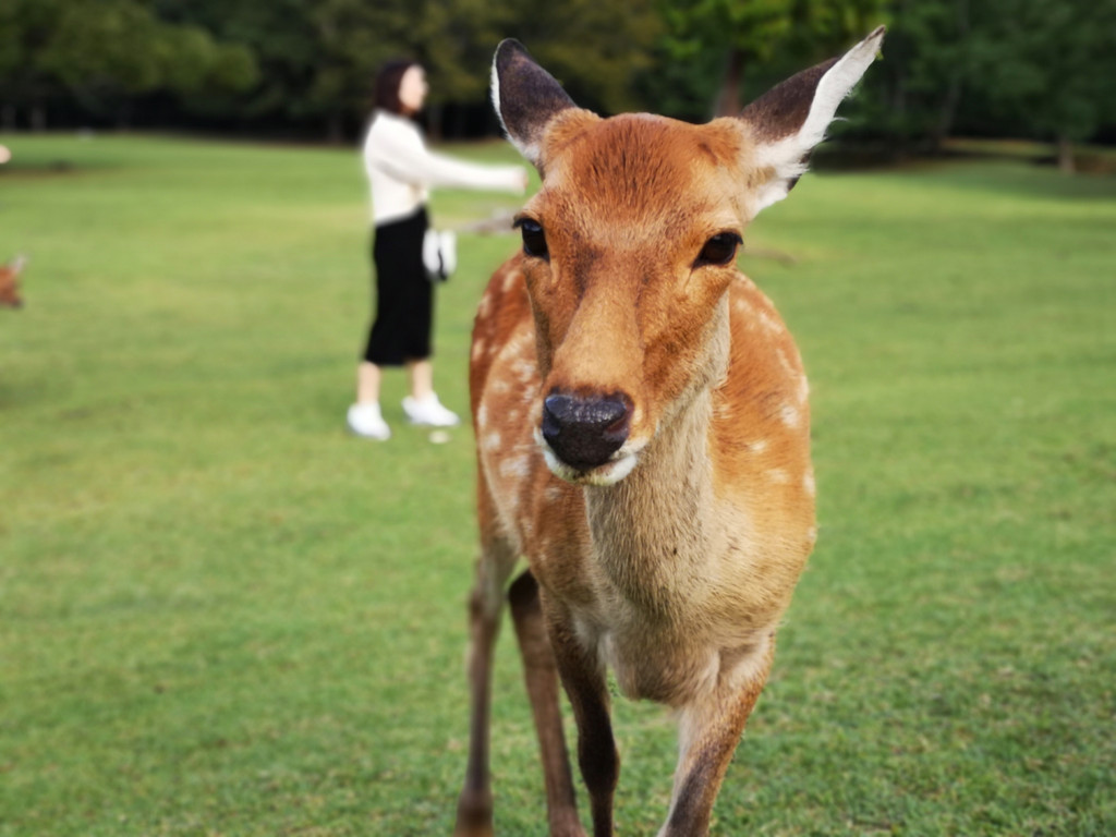 关西机场很大,不管去哪个地方,一般需乘坐南海电铁到其他中转站转车,建议随身携带轨道交通图。为了省时间,下午直接出发去奈良找小鹿,行李也直接寄存在了奈良车站,很方便。出了近铁站,整座城市都是小鹿,萌化了老夫的少女心。近铁门口有公交去往奈良公园,不需门票,但可以买包草饼(300日币),小鹿很爱吃~特别是要拍照的小伙伴,没有草饼,你基本连靠近它们的机会都没有。