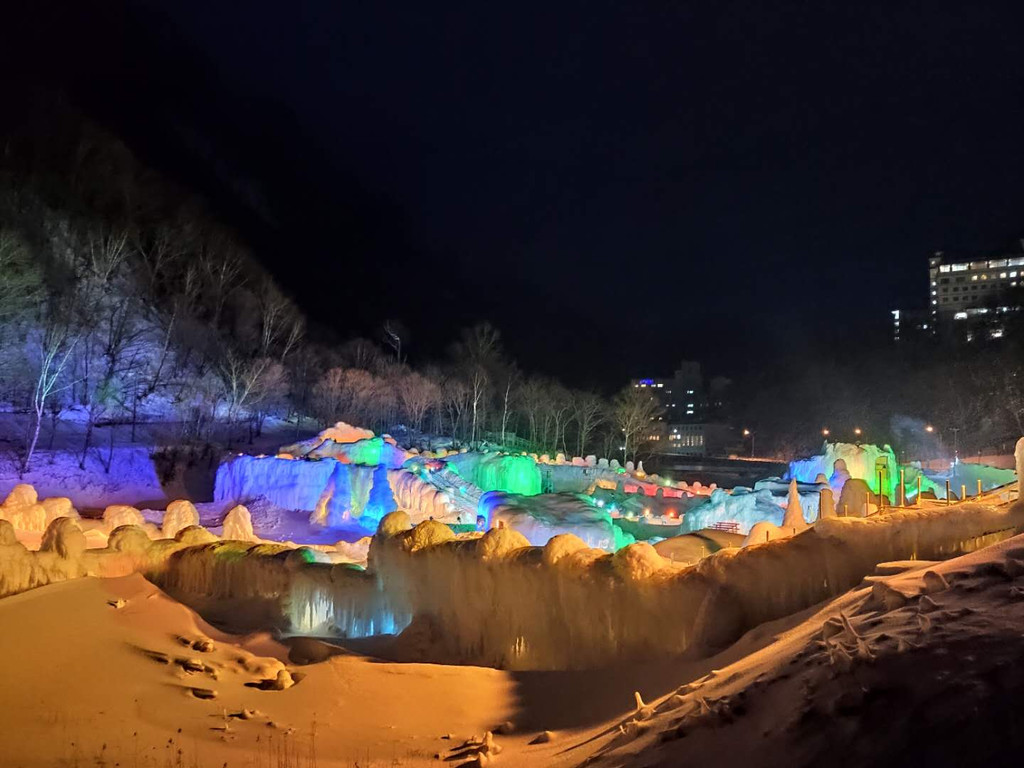 白须瀑布就是在一座桥上拍个小瀑布,但是那个瀑布结冰了也还是很漂亮的,就是桥的围栏太矮,总感觉孩子随时就要滑下去,随便拍了两张照片就走了