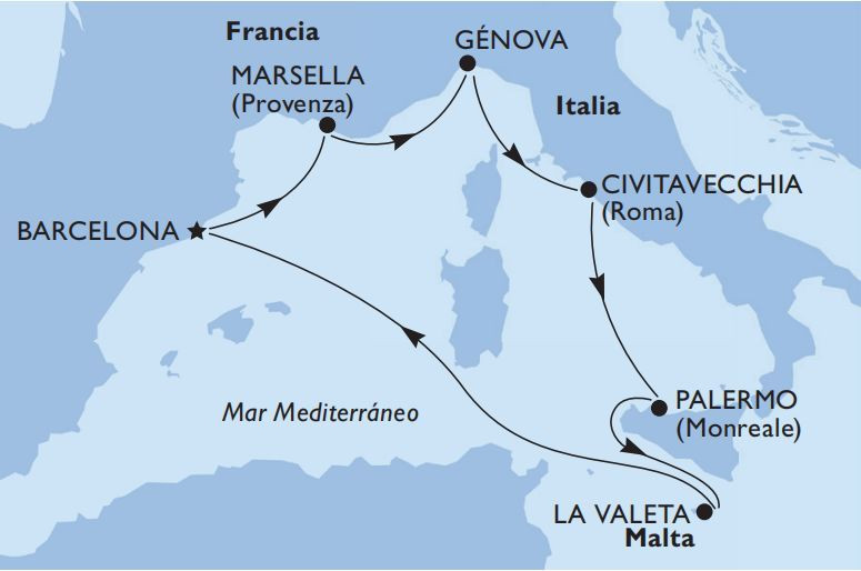 最终我选择了热那亚上船,中途停靠意大利的奇维塔韦基亚,西西里岛的巴勒莫,马耳他的瓦莱塔,西班牙的巴塞罗那和法国马赛。而我选择热那亚是因为家人飞抵罗马后,将游览罗马、天空之城~巴尼奥雷焦,托斯卡纳奥尔恰谷、佛罗伦萨、热那亚和五渔村等。