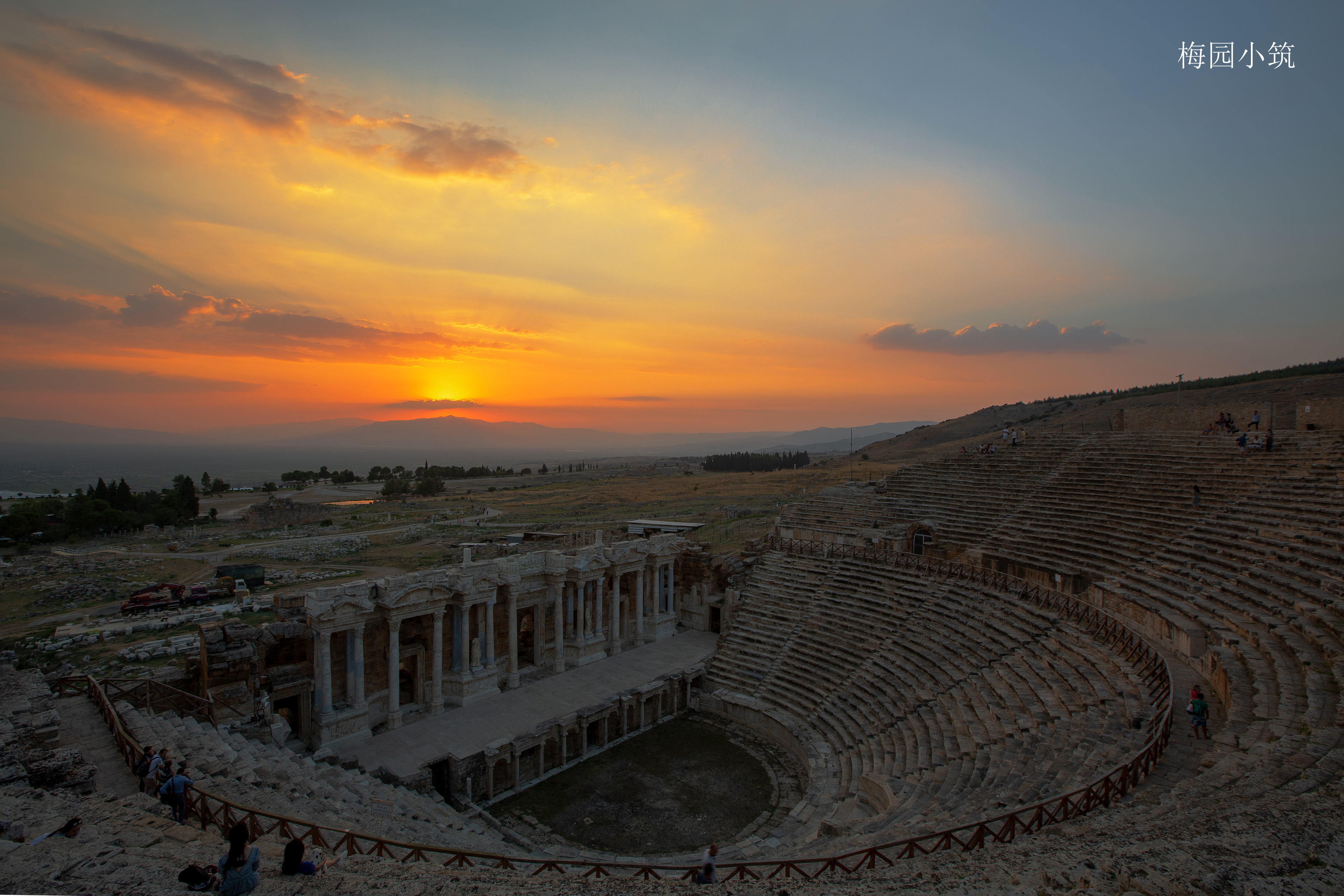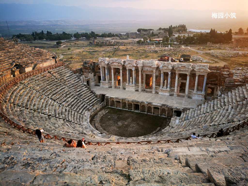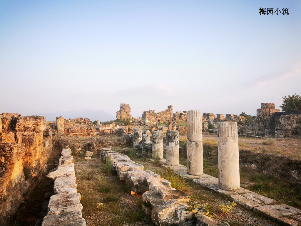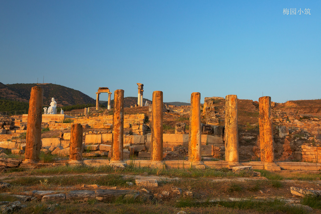 其实当时城市中最重要的建筑是献给希拉波利斯的保护神阿波罗·莱贝诺斯的神庙,现在访客们只能看到这座多利安式希腊式神庙残余的地基,神庙里还有献给阿波罗、库柏勒、阿尔忒弥斯、普鲁托和波塞冬的祭坛,想来,当年这神庙一定是蔚为壮观,每一处遗址都在诉说着那一段难忘的岁月,夕阳的昏黄光芒披泽万物,更显出岁月的荒凉之感。