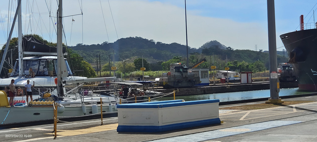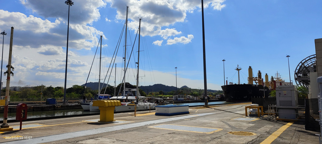 到了3点,后面一艘巨轮开进了船闸。当然这个巨轮只是相比游艇而言。真正的巨轮是从新扩建的更宽的运河航道走。我们这里也能看到,相隔几十米而已。