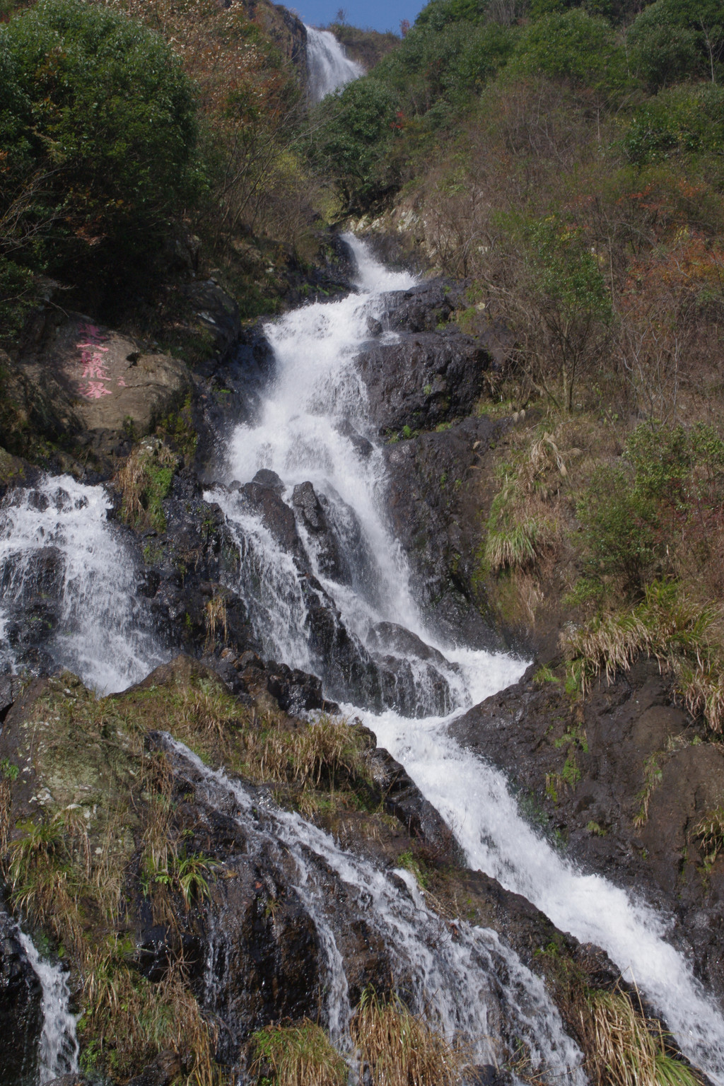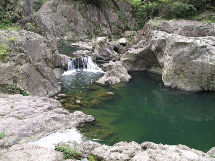 缘溪而下,绕山而转,一路风景悠然,撩人心眼。梅花瀑布,斤丝潭,龙王古庙,还有千米平板长溪,蜿蜒而去。这段宽约10至15米、光洁平坦的石质河床,是一亿年前火山喷发时形成的,夏季游客都喜欢在浅浅的溪中行走,或卧溪中顺水漂流。平板溪尽头是茶坞口田野,仰望石狲岩,巍峨俊秀,上有许多横径孔洞和峰柱。过红叶满山、一路清香等景点,至栗树坞口村,双石壁双瀑布双清潭间,是成片的古林丛。此处可望见大盘山主峰,西行可入杏珠坞竹林。