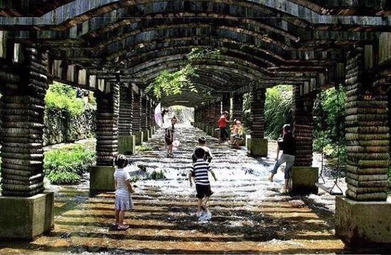花溪之景,美在自然,单看那平板长溪就会让人叹为观止。平板溪总长逾3000米,裸露部分长1080米,整条溪底平整如削,无沙土积岩,溪中可滑冰、骑车。平板溪上细流委婉,清澈见底,人赤足走在平板溪上,河床轻抚脚底,小鱼在趾间穿梭,这无疑是一处绝美的天然足浴场!在炎炎夏日,涉平板溪流,戏花溪水,更是妙不可言、乐趣无究。
