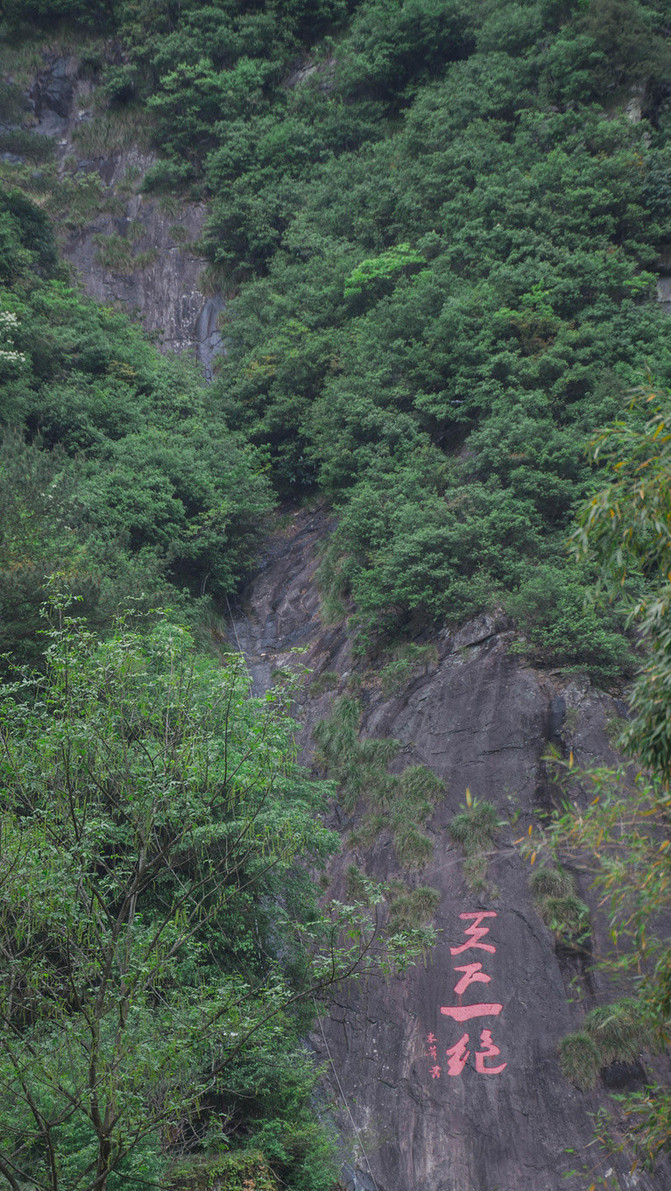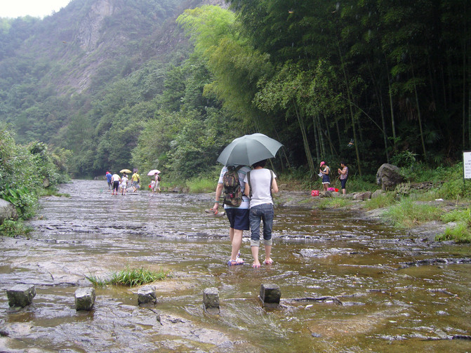 缘溪而下,绕山而转,一路风景悠然,撩人心眼。梅花瀑布,斤丝潭,龙王古庙,还有千米平板长溪,蜿蜒而去。这段宽约10至15米、光洁平坦的石质河床,是一亿年前火山喷发时形成的,夏季游客都喜欢在浅浅的溪中行走,或卧溪中顺水漂流。平板溪尽头是茶坞口田野,仰望石狲岩,巍峨俊秀,上有许多横径孔洞和峰柱。过红叶满山、一路清香等景点,至栗树坞口村,双石壁双瀑布双清潭间,是成片的古林丛。此处可望见大盘山主峰,西行可入杏珠坞竹林。
