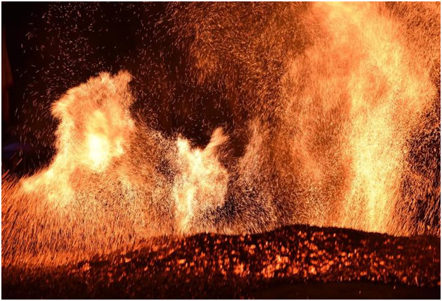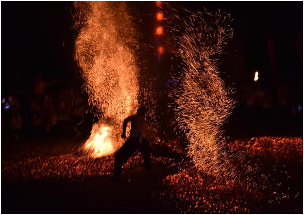 10月4日晚,磐安县双峰乡村民举办“炼火”表演。村民用百余筐木炭铺成火坛,在其间奔走穿梭,场面热闹惊险刺激宏伟。来自于周边各地的乡民和诸多游客观赏了这古老的活动。