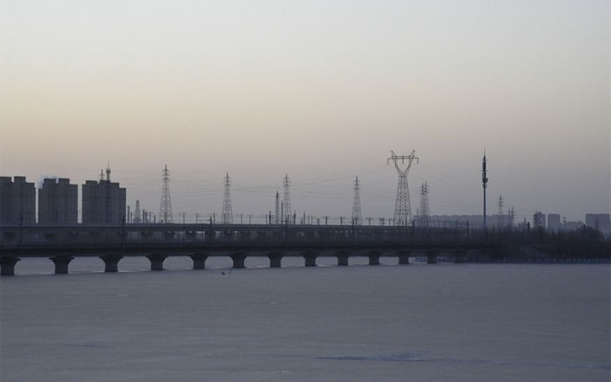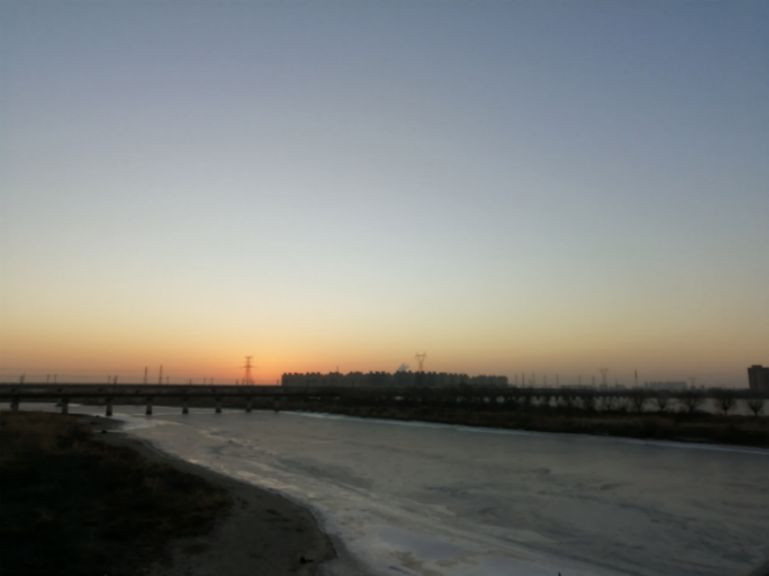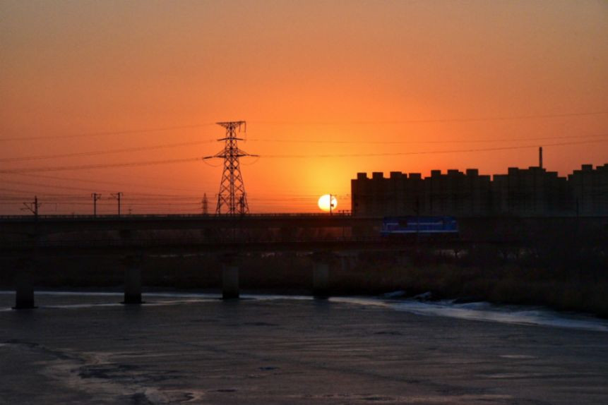 在双台子河对岸一排拔地而起的楼宇和电线塔的映衬下,日头突然露出了一个红帽,横卧在铁轨上。然后似乎开始加速上升,直到整个红日突然从地平线之下跳脱出来。