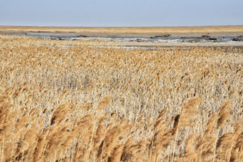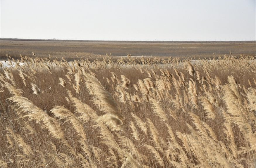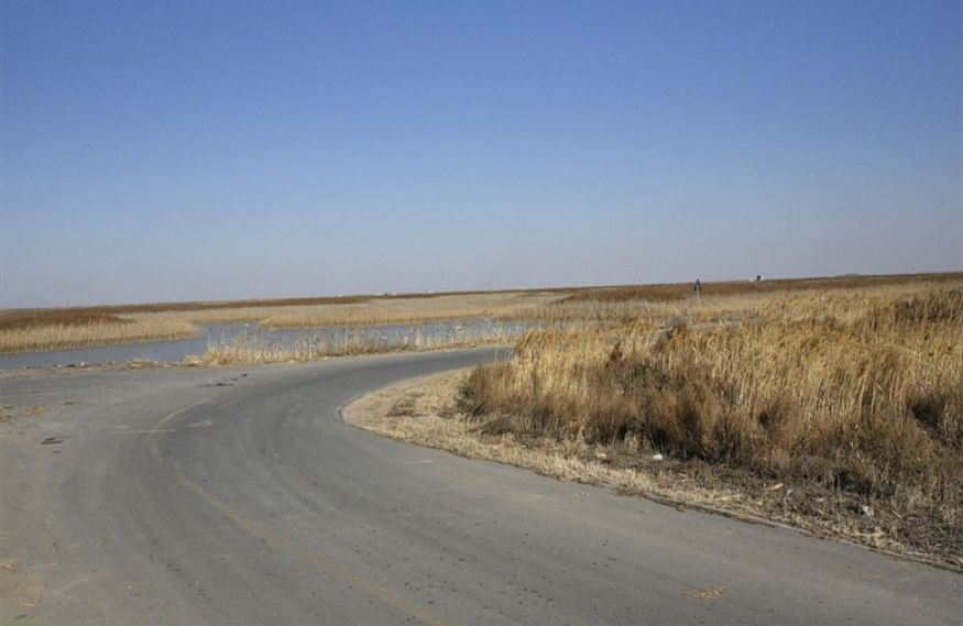 随着车轮慢慢深入保护区的腹地,景色开始变得单一,茫茫苇塘里连一辆车都看不到。满目都是收割完毕的芦苇,看起来觉得忽然有点儿像内蒙古大草原的秋景。