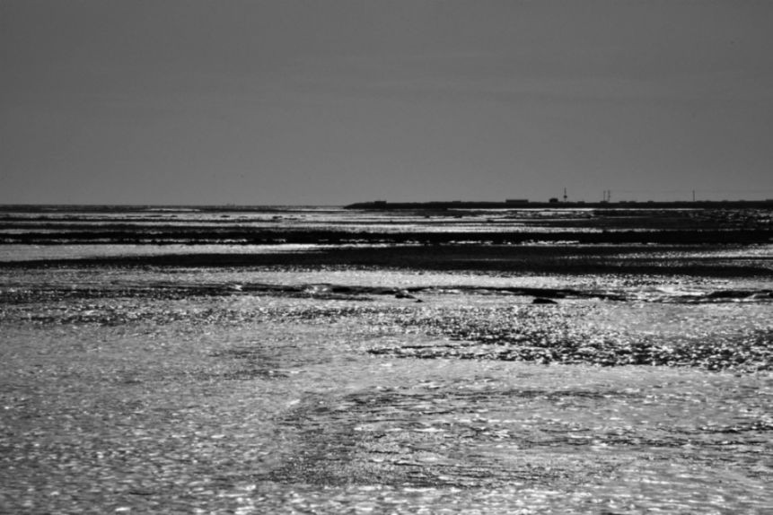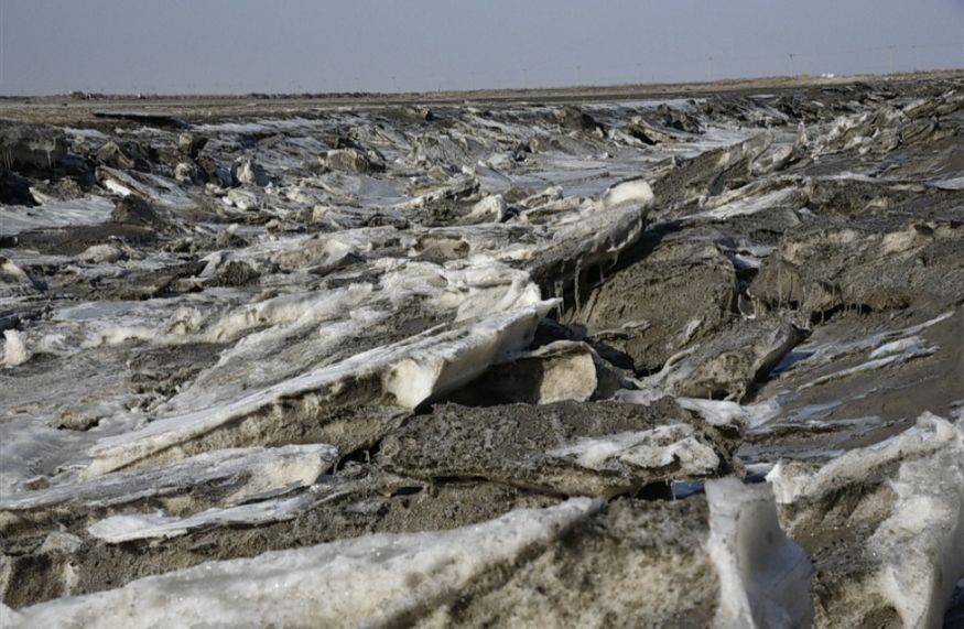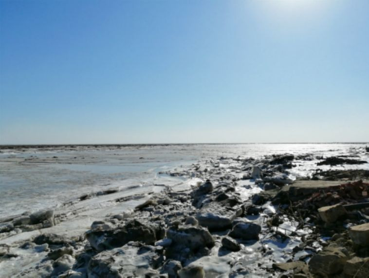 看到了飘着浮冰的海岸线,在北风中显得很是凄冷;看到了如犬牙交错一般生长着的冰凌,在阳光照耀下散发着别具一格的粼粼波光;看到了整整齐齐的海产养殖的网状鱼塘,正在经历退养还滩。