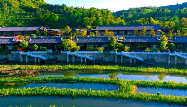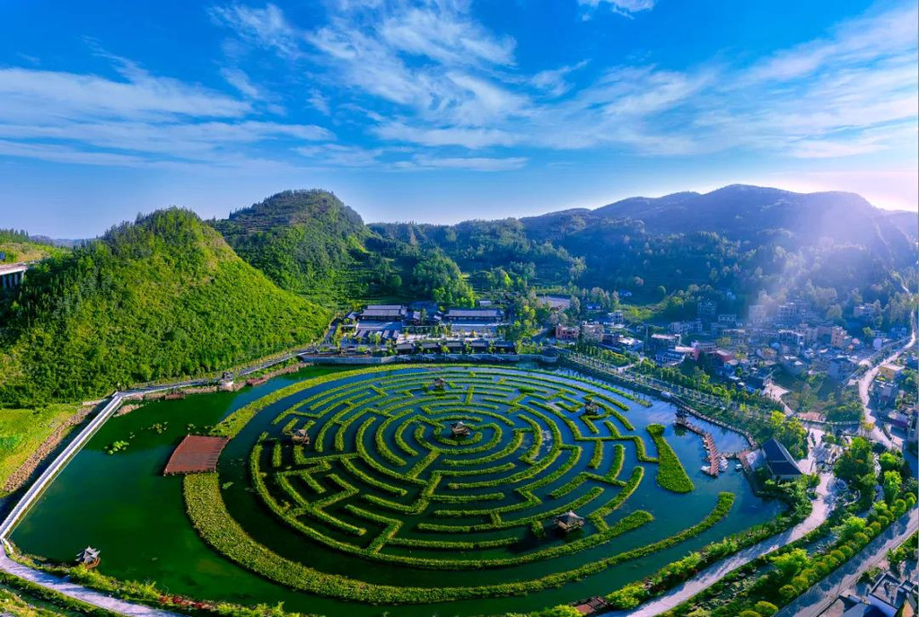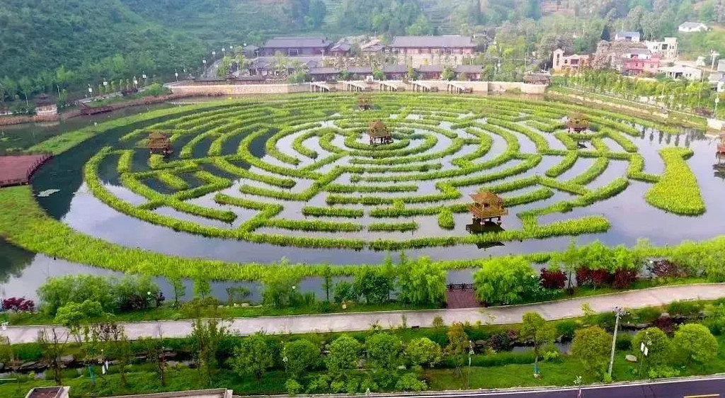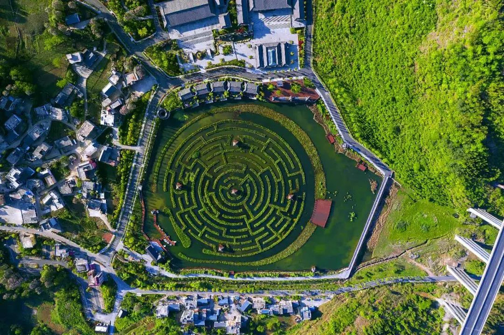 登高俯瞰,山水相间处,村庄散落其中。莲池迷宫九进九出,却只有一条渠道能到达中央观景亭,别致新奇。