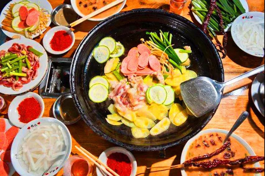六盘水烙锅,堪称“西部一绝”,蘸料除了辣椒面还有麻辣折耳根蘸水、烧青椒蘸水等,它无所不烙,各种荤素都有,臭豆腐和乌洋芋片是标配,喜欢吃肉的可以点牛肉、五花肉、鸡皮、火腿肠等,放点新鲜的蔬菜裹裹油,夹一块蘸着辣椒一起放入嘴里,别提有多美味了。