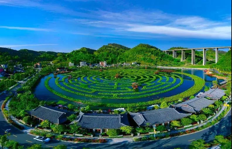 从高空俯瞰,像一幅九宫八卦图一般。边上的村寨里,绿树掩映之间,错落着一栋栋小洋楼和古风民宿酒店……好一幅写意的风景画!