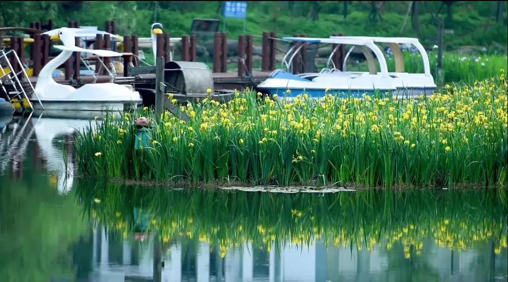 面积数十亩的一湾秀水,环状种植了各色的菖蒲,尤以黄花菖蒲居多,放眼望去,满眼都是柔嫩的黄色。其中零星可见一些白色和紫色的鸢尾花,还有一些睡莲,像未睡醒一般,花瓣睡意朦胧的半张着。