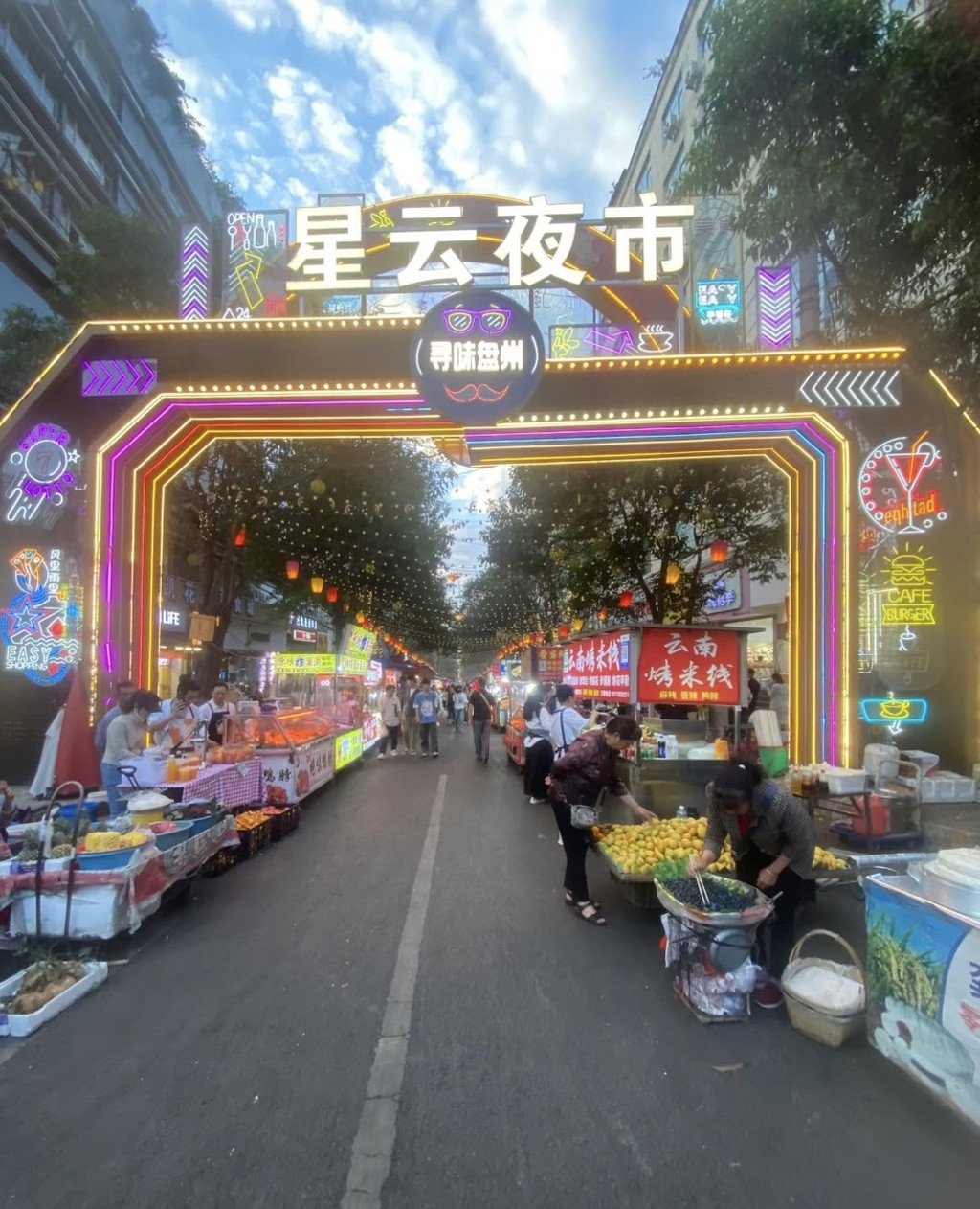 傍晚后,星云夜市(步行可达)和盘州夜市逐渐热闹起来。这里能喝到用本地刺梨榨的酸甜饮料,吃到绵密解暑的特色冰浆,卤味摊子的鸡爪和鸭翅卤得入味,适合边走边啃。若偏爱重口味,丹霞北路玉兰小吃(下午五六点出摊至凌晨)的菌子燃面和蹄花圆子粉值得一试,菌子的鲜香与辣椒的刺激碰撞出独特风味。