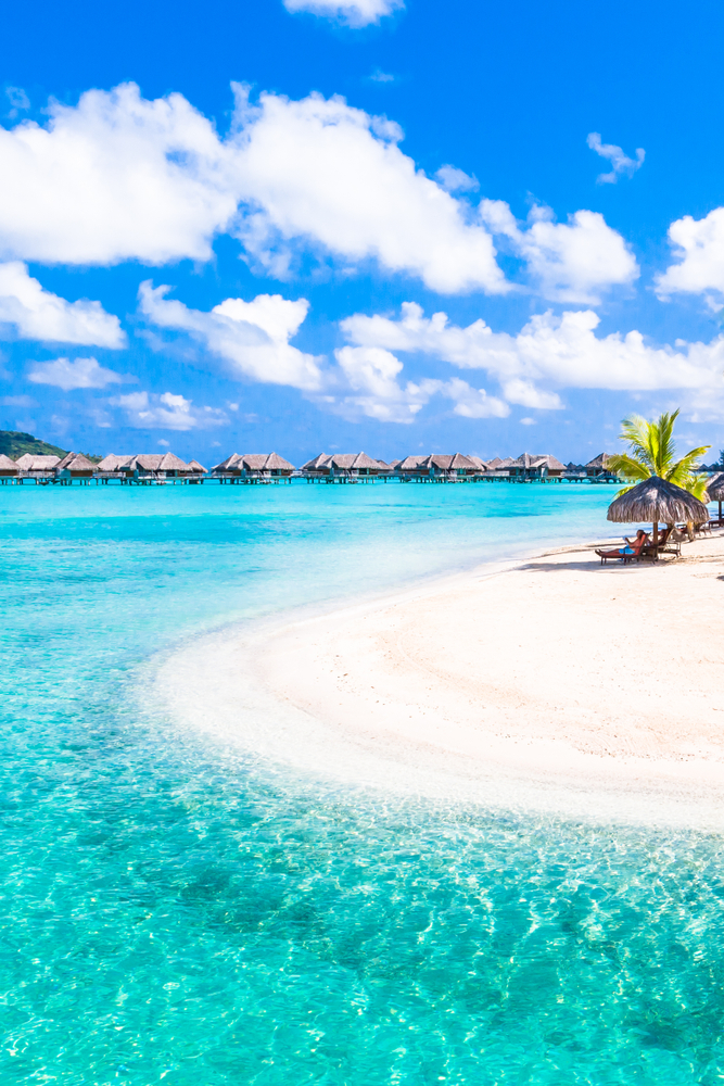 精致的水上小屋,在纯净的潟湖水上依次排列,一直延展至远方大海的尽头。