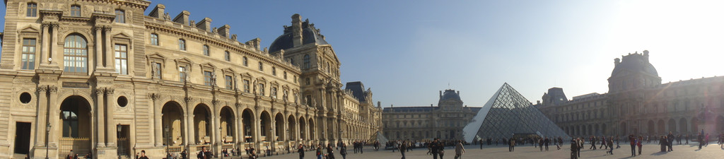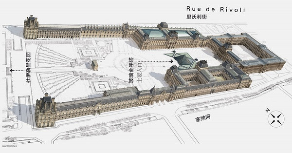 卢浮宫的外观是由三个宫殿组成的U型庭院,庭院中央是1989年加建的贝聿铭所设计的玻璃金字塔