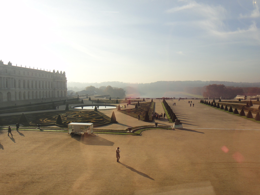 人在凡尔赛宫内,眺望楼下的花园